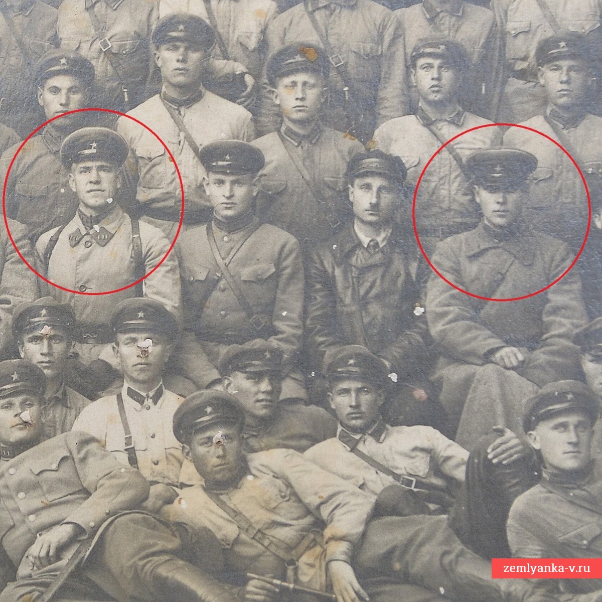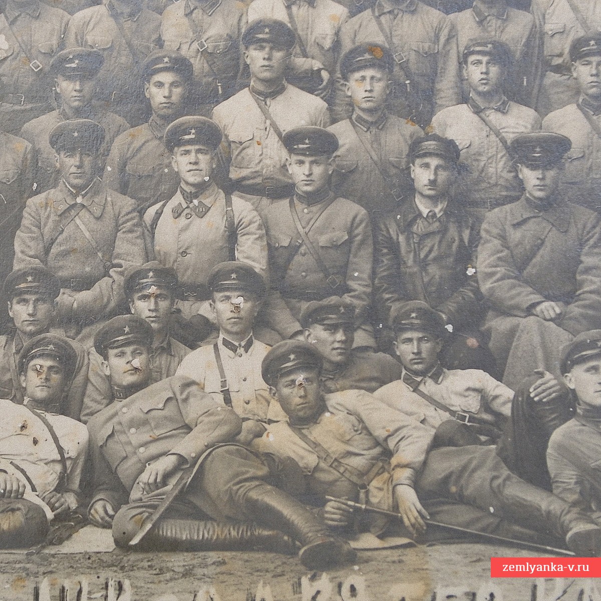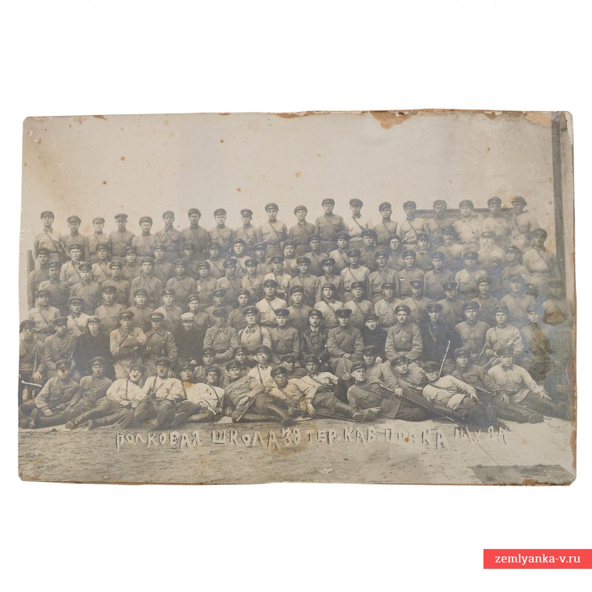 Крайне редкий снимок в хорошем коллекционном состоянии. Размер 220*145 мм. Фото наклеено на картон. В центре сидит хорошо узнаваемая фигура будущего маршала Победы Георгия Жукова, который в этот период являлся командиром 39-го кавалерийского полка. Слева от будущего маршала, по мнению некоторых специалистов, сидит К. Рокоссовский (обведен красным). Редкий групповой снимок, гарантия подлинности.