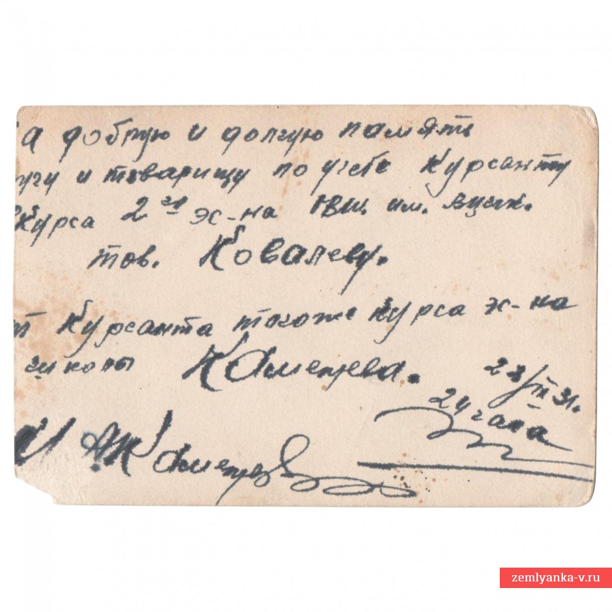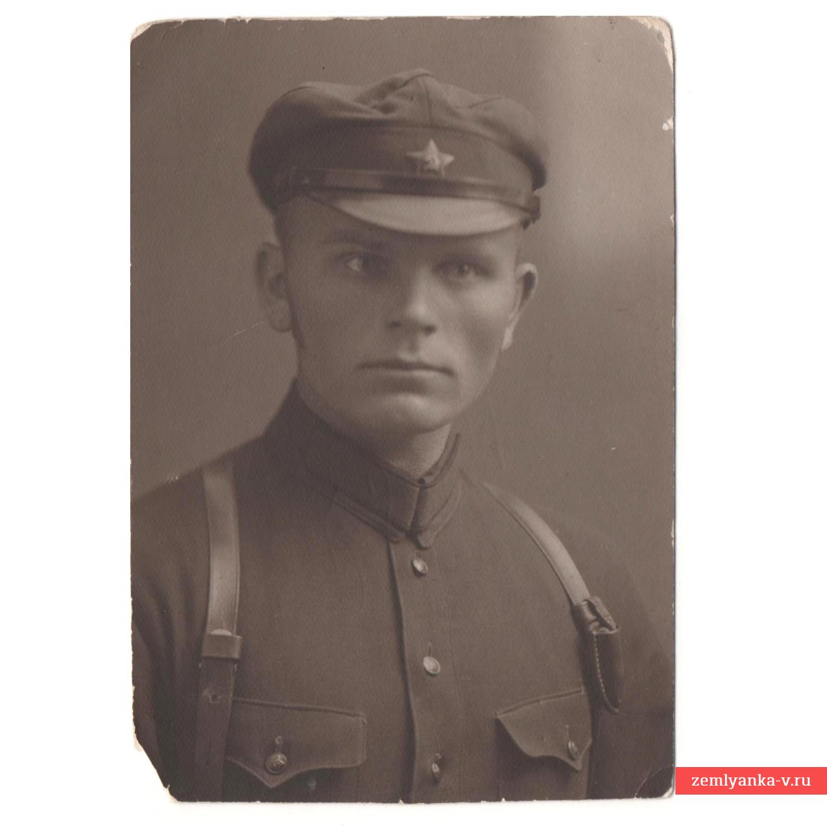 Оригинальный снимок в отличном коллекционном состоянии. Изображенный на фото красноармеец одет в гимнастерку образца 1924 года, цветную фуражку образца 1926 года и полевое снаряжение. Размер 85*125 мм. Оборотная сторона содержит дарственную подпись. Гарантия подлинности.