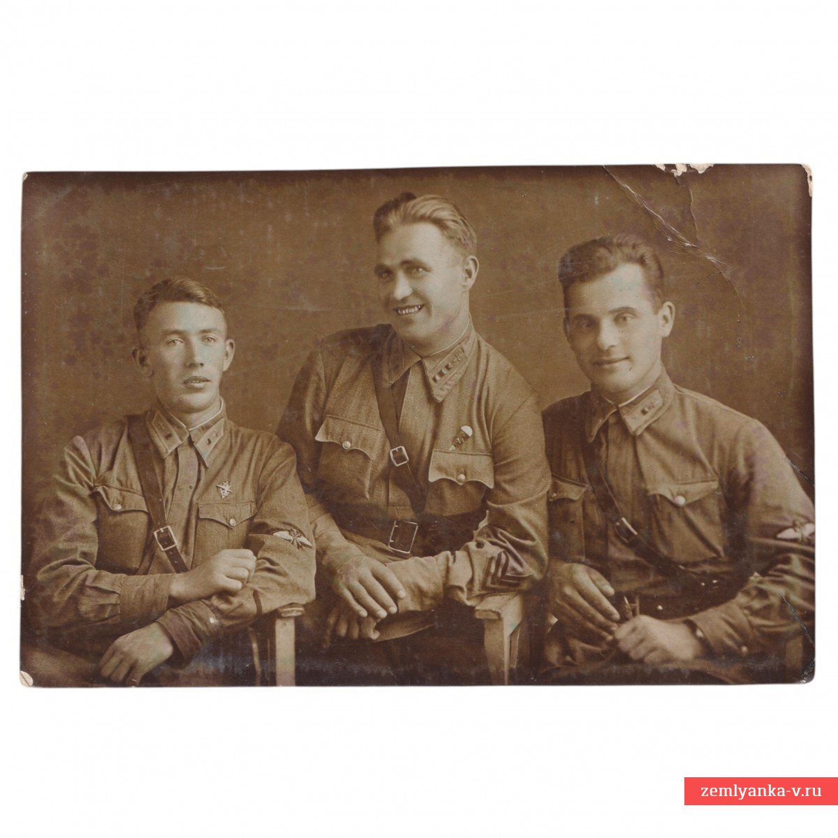 Оригинальный довоенный снимок в хорошем состоянии. Размер 87*133 мм. Оборотная сторона чистая. На гимнастерке мл. лейтенанта знак образца 1938 года об окончании летного училища, у старшего лейтенанта знак инструктора парашютного спорта. Гарантия подлинности.