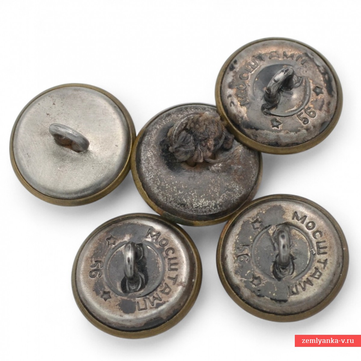 Лот включает в себя 5 пуговиц. Клейма «МОСШТАМП». На некоторых проставлен год изготовления – 1956. Сохранность складская. Гарантия подлинности.
