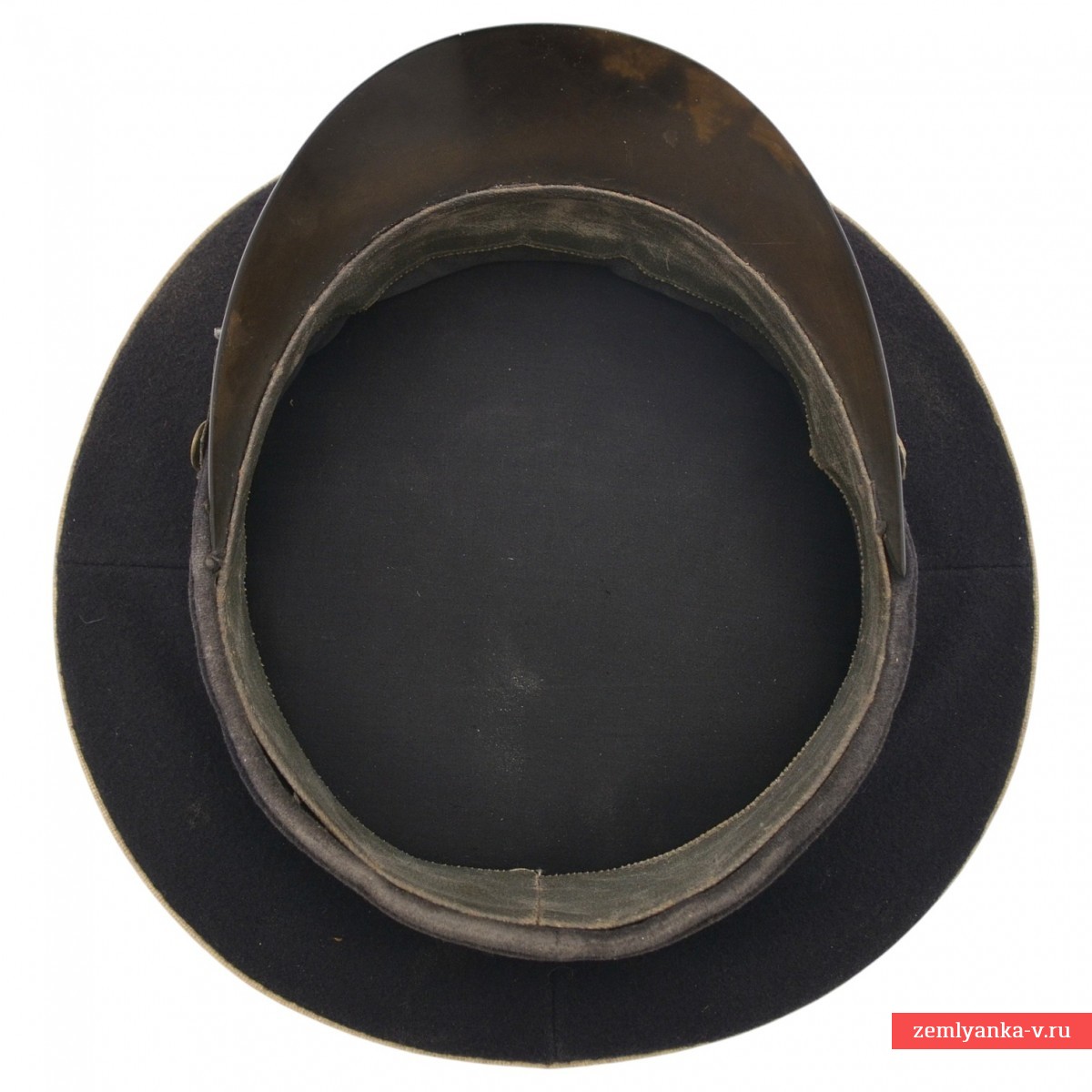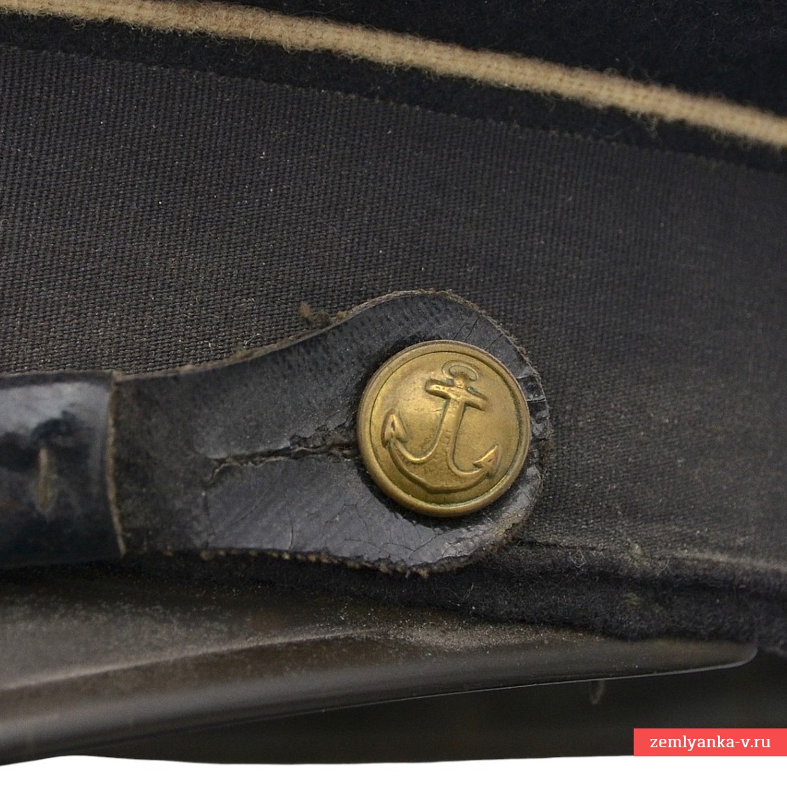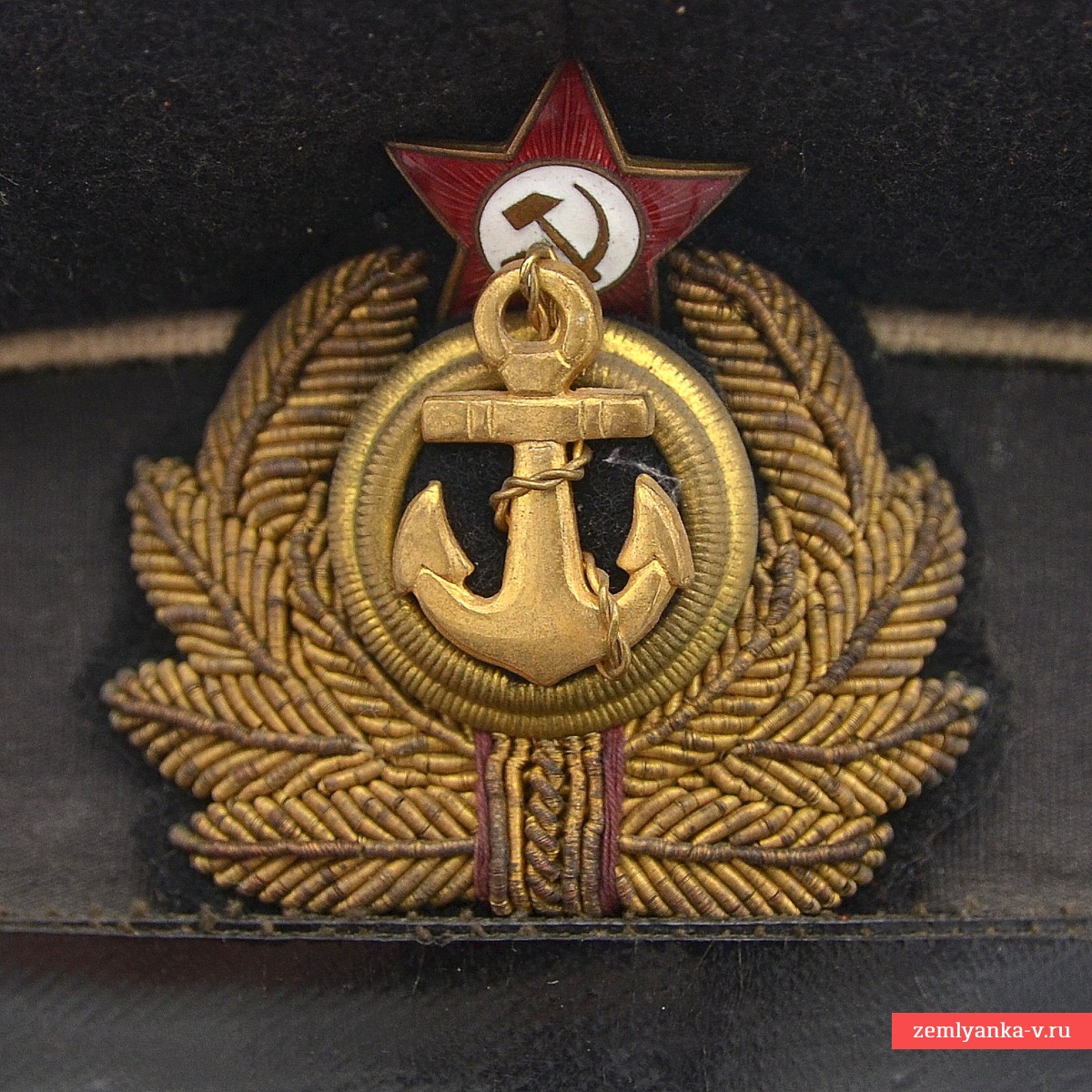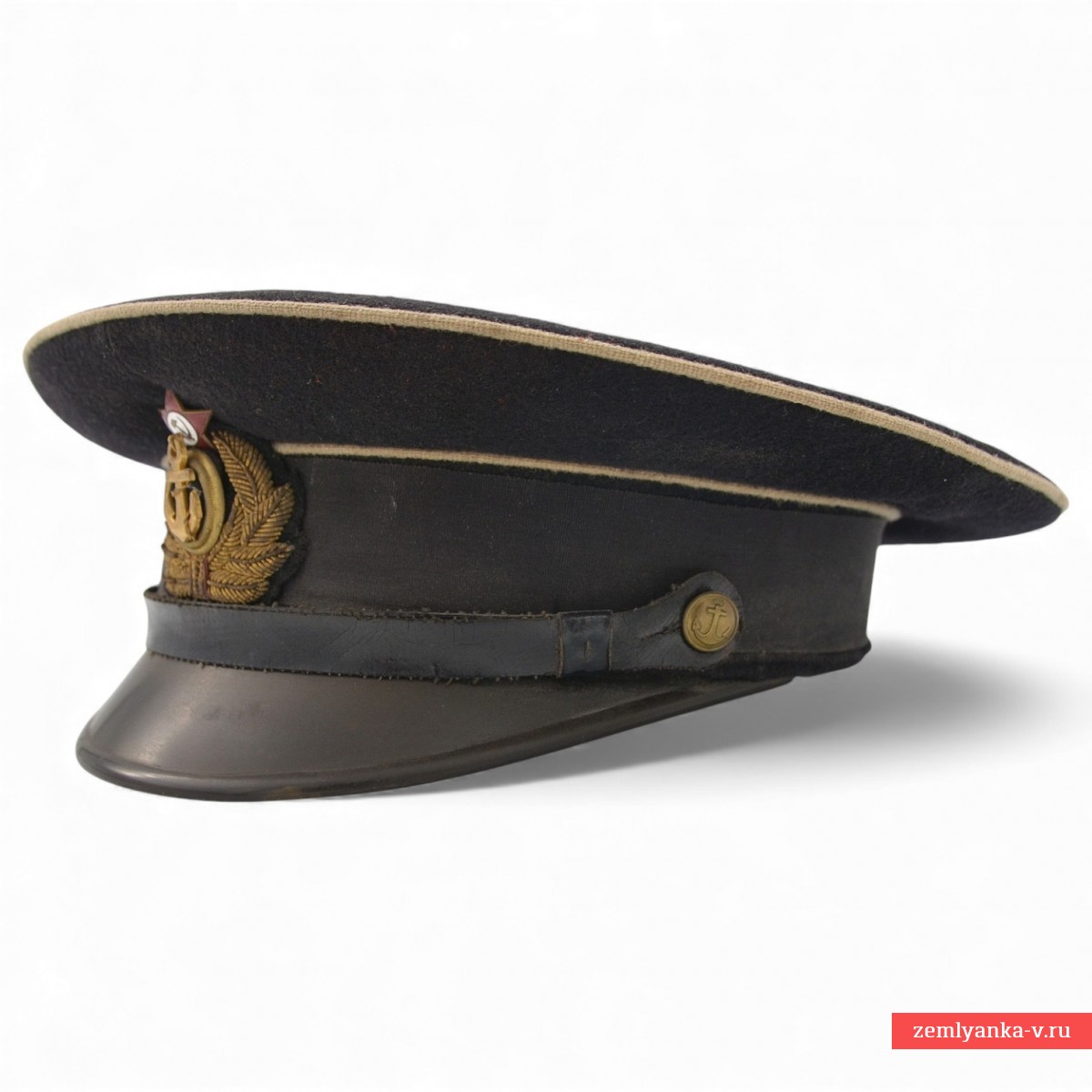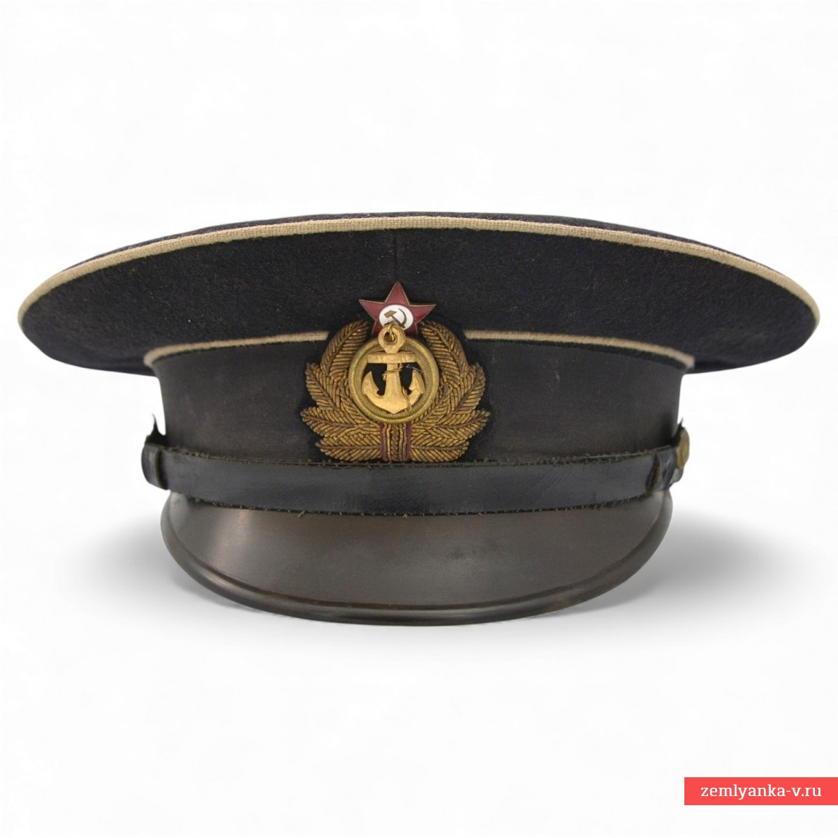 Оригинальная фуражка в удовлетворительном состоянии. Сукно, дерматин, пластик. Подкладка фуражки — сатиновая. Подтулейник — из дерматина. Перед фуражки прямой, слегка выпуклый, с жесткой стойкой, внутрь вставлен металлический каркас. Козырек фуражки фибровый, черный, лакированный, удлиненной полукруглой формы. Над козырьком, к форменным латунным пуговицам, пристегнут черного цвета подбородный ремешок. Звезда и бухта раздельные. По верхнему краю околыша и тульи – кант белого цвета (корабельная служба). Введена приказом Наркома ВМФ №426 от 20 октября 1939 года. C учетом того, что Приказом Наркома ВМФ СССР № 51 от 15 февраля 1943 года на козырек фуражки старшего командного состава корабельной и инженерно-корабельной службы введен орнамент, фуражку можно датировать 1939-43 гг. Гарантия подлинности.