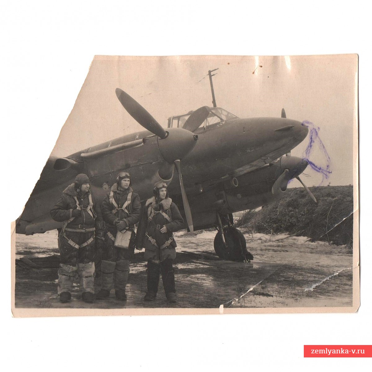 Оригинальный и достаточно редкий фронтовой снимок в неплохом коллекционном состоянии. На оборотной стороне следы вклейки в альбом. Утрата верхнего уголка. На фото слева командир полка гв. подполковник В.И. Дымченко, в центре – штурман полка майор Попов, справа — стрелок-радист сержант Пуховой. Подробнее о командире полка здесь http://allaces.ru/p/people.php?id=29. Размер 108*147 мм. Из фронтового альбома офицера полка. Гарантия подлинности.