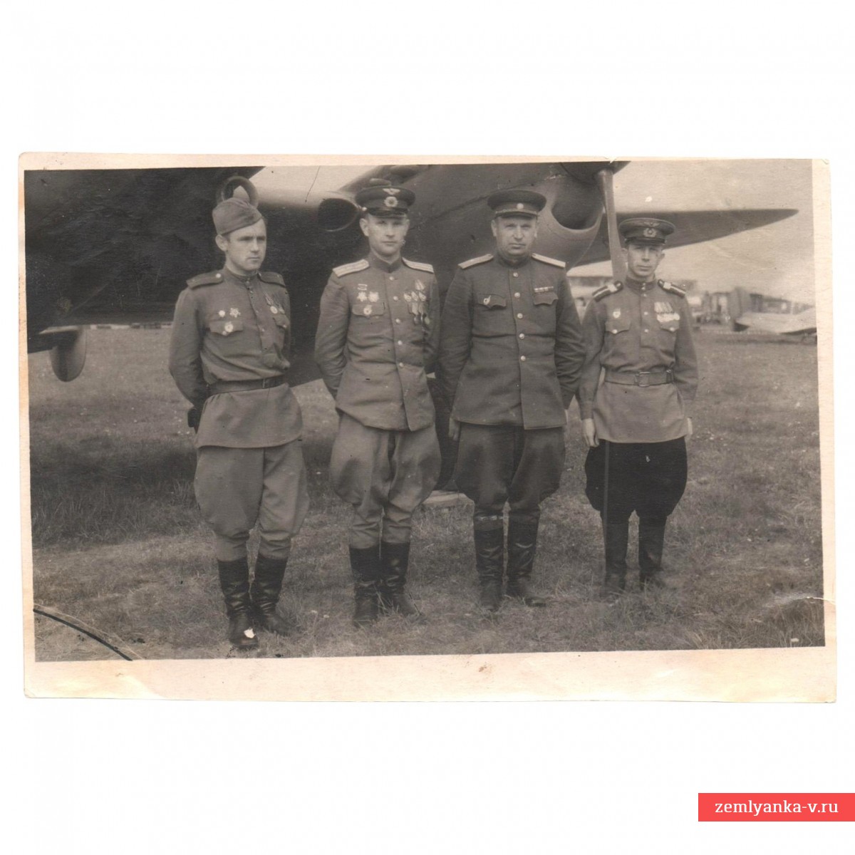 Оригинальный и достаточно редкий фронтовой снимок в очень хорошем коллекционном состоянии. На оборотной стороне следы вклейки в альбом. Размер 110*165 мм. Из фронтового альбома офицера полка. На фото в центре Сергей Павлович Андреев (7.10.1901, г. Великие Луки — 27.7.1990, Шереметьевское кладбище г. Долгопрудный) — генерал-майор авиации (4.2.44 № 115), призван в РККА (1922), окончил: 2-ю Борисоглебскую военную школу летчиков (1928), участник советско-финляндской войны (1939-40), командир 3 гвардейской бомбардировочной авиационной Смоленской орденов Суворова и Кутузова дивизии (22.1.43-1946); награждён орденами: Ленина (6.11.47), Красного Знамени (21.5.40, 7.7.44 и 3.11.44), Суворова 2-й (19.4.45) и 3-й ст. (5.9.43), Отечественной войны 1-й ст. (6.4.85), Красной Звезды (25.5.36); мемуары «Крылом к крылу» (1962). Рядом с ним стоит штурман полка майор Попов. Гарантия подлинности.