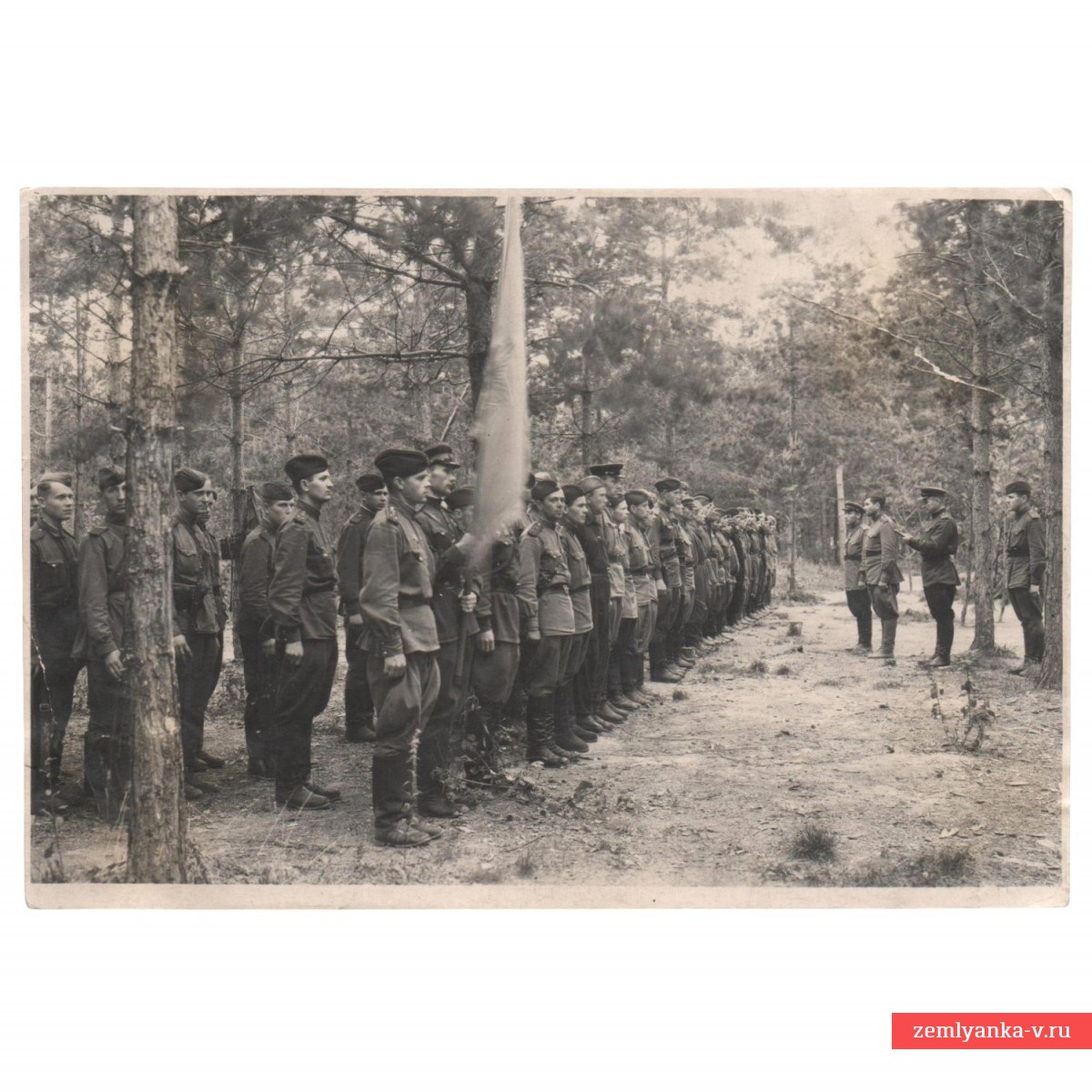 Оригинальный и достаточно редкий фронтовой снимок в очень хорошем коллекционном состоянии. На оборотной стороне следы вклейки в альбом. Размер 113*170 мм. Из фронтового альбома офицера полка. Гарантия подлинности.
