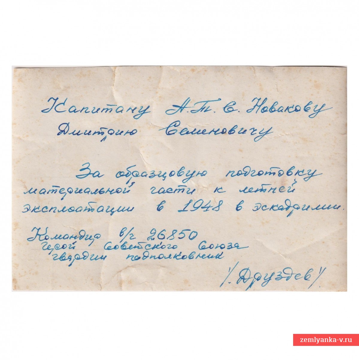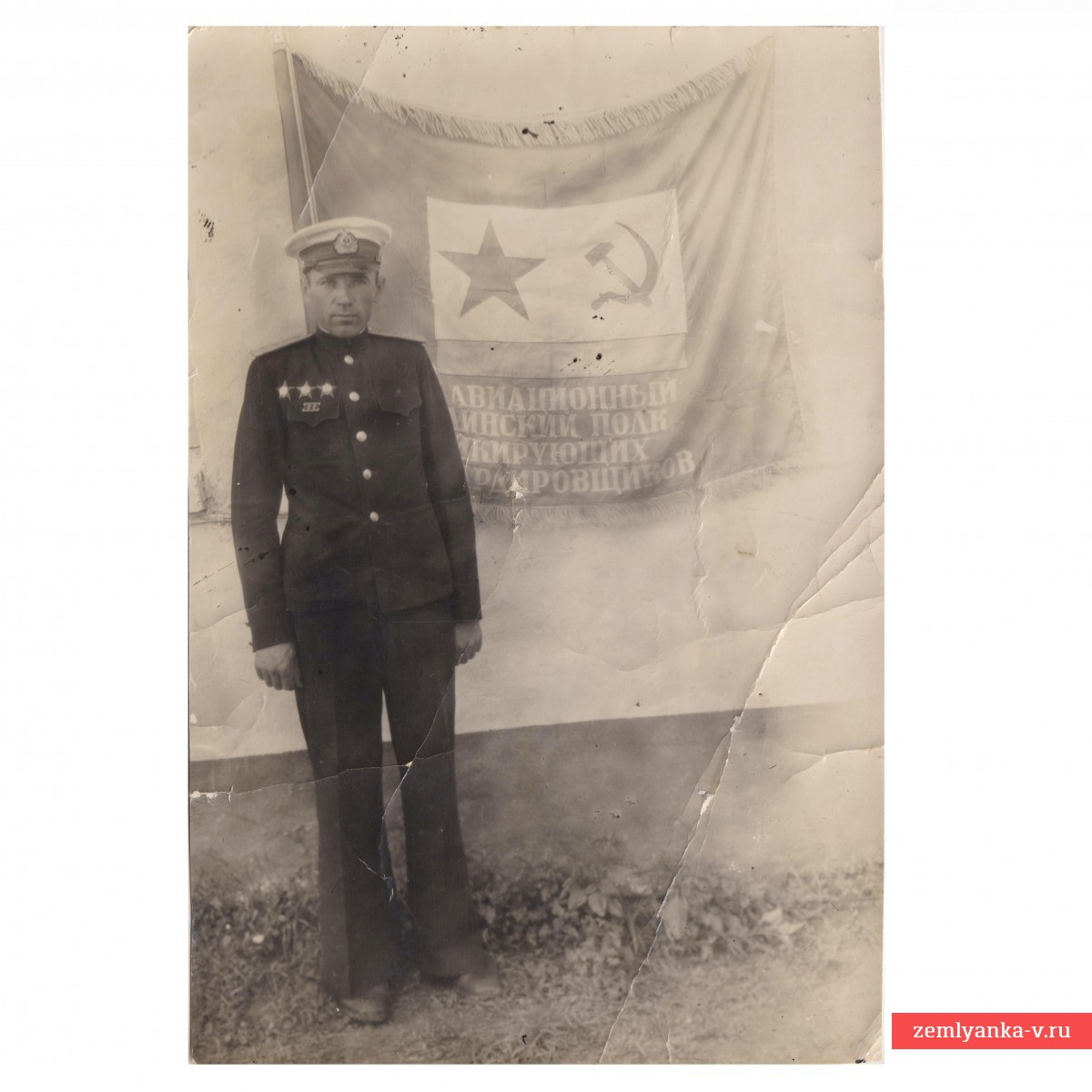 Оригинальный наградной снимок к знамени 34-го авиационного полка пикирующих бомбардировщиков в отличном состоянии. На фото Новиков Дмитрий Семенович –гвардии капитан морской авиации, кавалер 3-х орденов «Красная звезда» (первый он получил в 1935 году за успешное выполнение боевой подготовки. В РККА с октября 1932 года). Тыльная сторона фото подписана собственноручно Героем Советского союза Друздевым Николаем Игнатьевичем. Размер 105*157 мм. Гарантия подлинности.