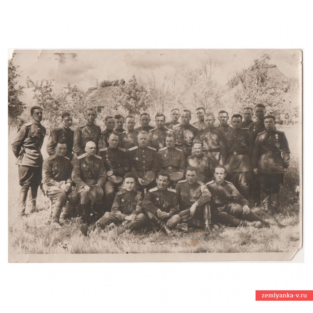 Оригинальный групповой снимок, сделанный в конце войны. Владелец фото подробнейшим образом перечислил наименования дивизий, а также фамилии изображенных. Размер фото 115*160 мм. Гарантия подлинности.