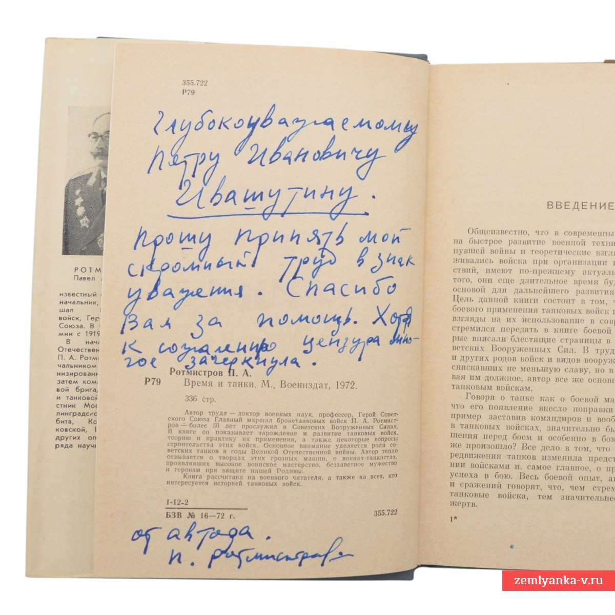 Оригинальное издание, написанное командующим легендарной 5-ой танковой армии, принимавшей участие в стажениях за Сталинград, в Курской битве и многих других П.А. Ротмистровым. С собственноручным посвящением от маршала. Это военно-исторический труд, впервые опубликованный издательством «Воениздат» в 1972 году. Автор описывает зарождение и эволюцию танковых войск, анализируя теорию и практику их применения. Значительная часть книги посвящена роли советских танков в Великой Отечественной войне, а также взглядам на строительство бронетанковых сил до и во время конфликта. Ротмистров рассказывает о создателях боевых машин и подвигах воинов-танкистов. В оригинальной супер-обложке. Формат 135*205 мм. Объем 336 страниц. Посвящение адресовано Пётру Ивановичу Ивашутину (урожд. Ивашутич; 5 [18] сентября 1909, Брест-Литовск, Российская империя — 4 июня 2002, Москва, Россия) — руководителю органов государственной безопасности и военной разведки СССР. Генерал армии (1971), Герой Советского Союза (1985). Гарантия подлинности.