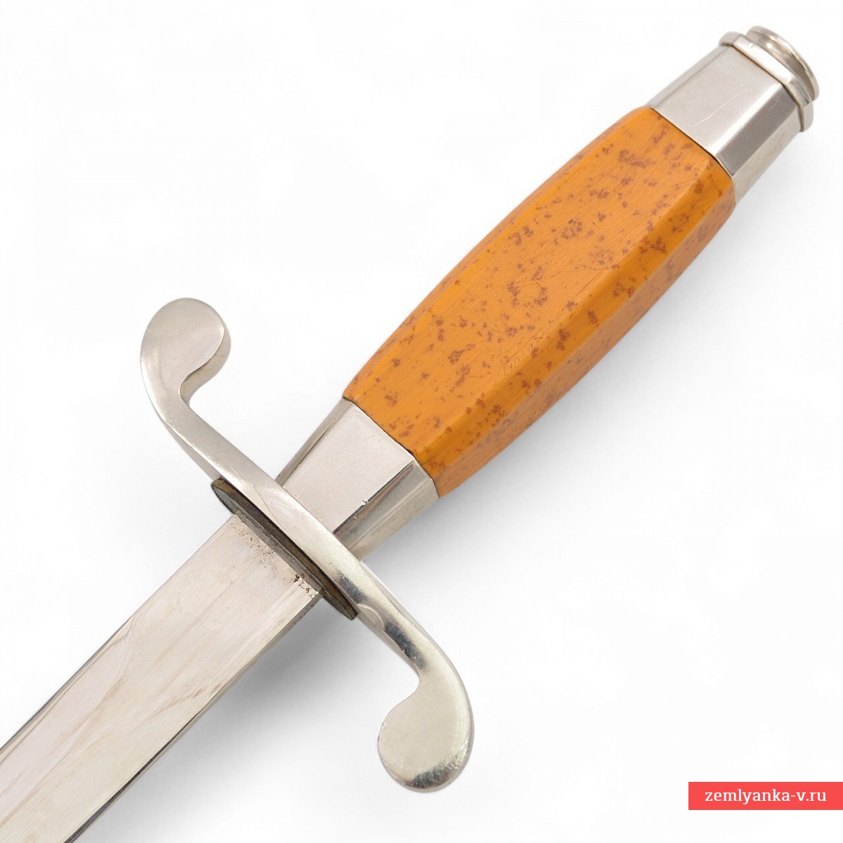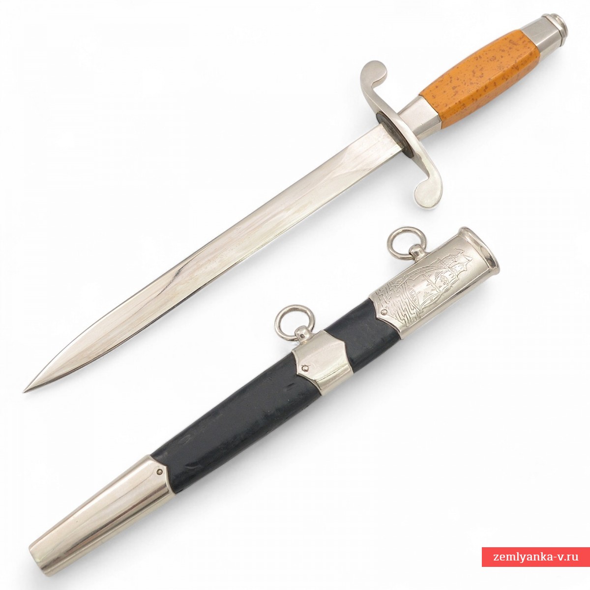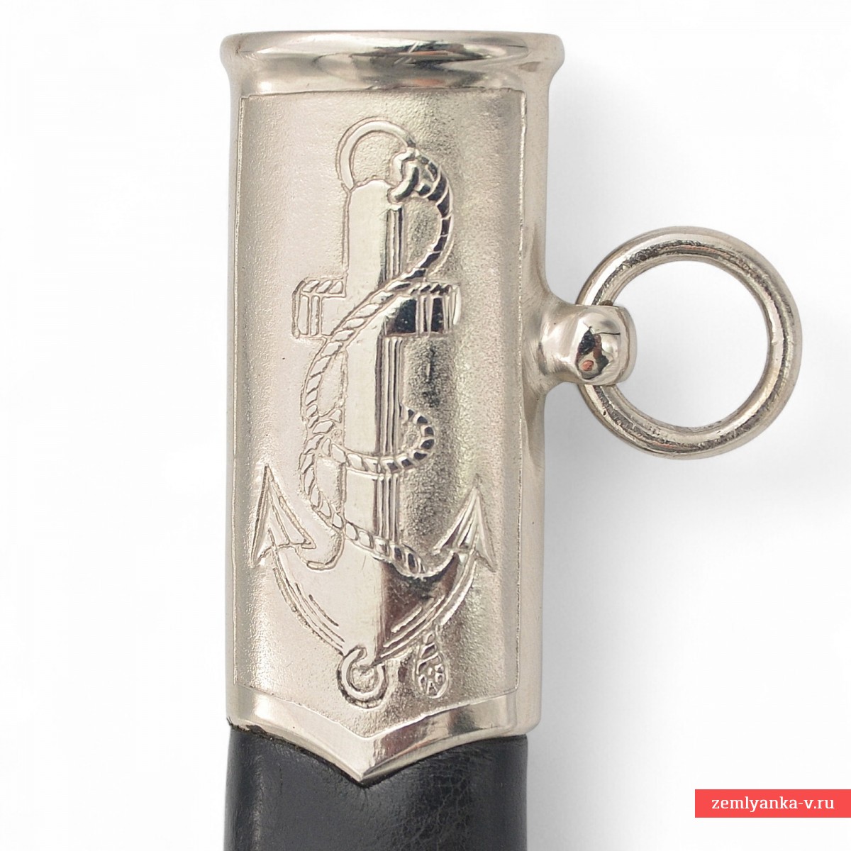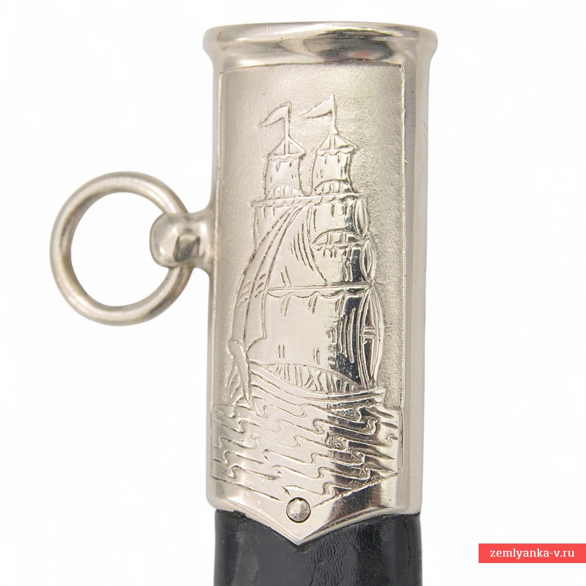 Оригинальный морской кортик в отличном коллекционном состоянии. Клинок имеет клейма только на хвостовике. Клинок, металлические части эфеса и ножен покрыты никелем, что означает принадлежность кортика офицеру речного флота. По нашему мнению, никелевое покрытие нанесено позднее на оригинальный морской кортик для увеличения его стоимости, однако утверждать это на 100% мы не можем, поэтому предмет продается по принципу «как есть». В любом случае, следует отметить исключительно высокое качество исполнения.