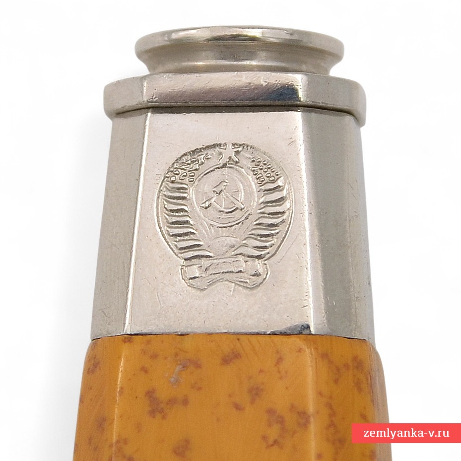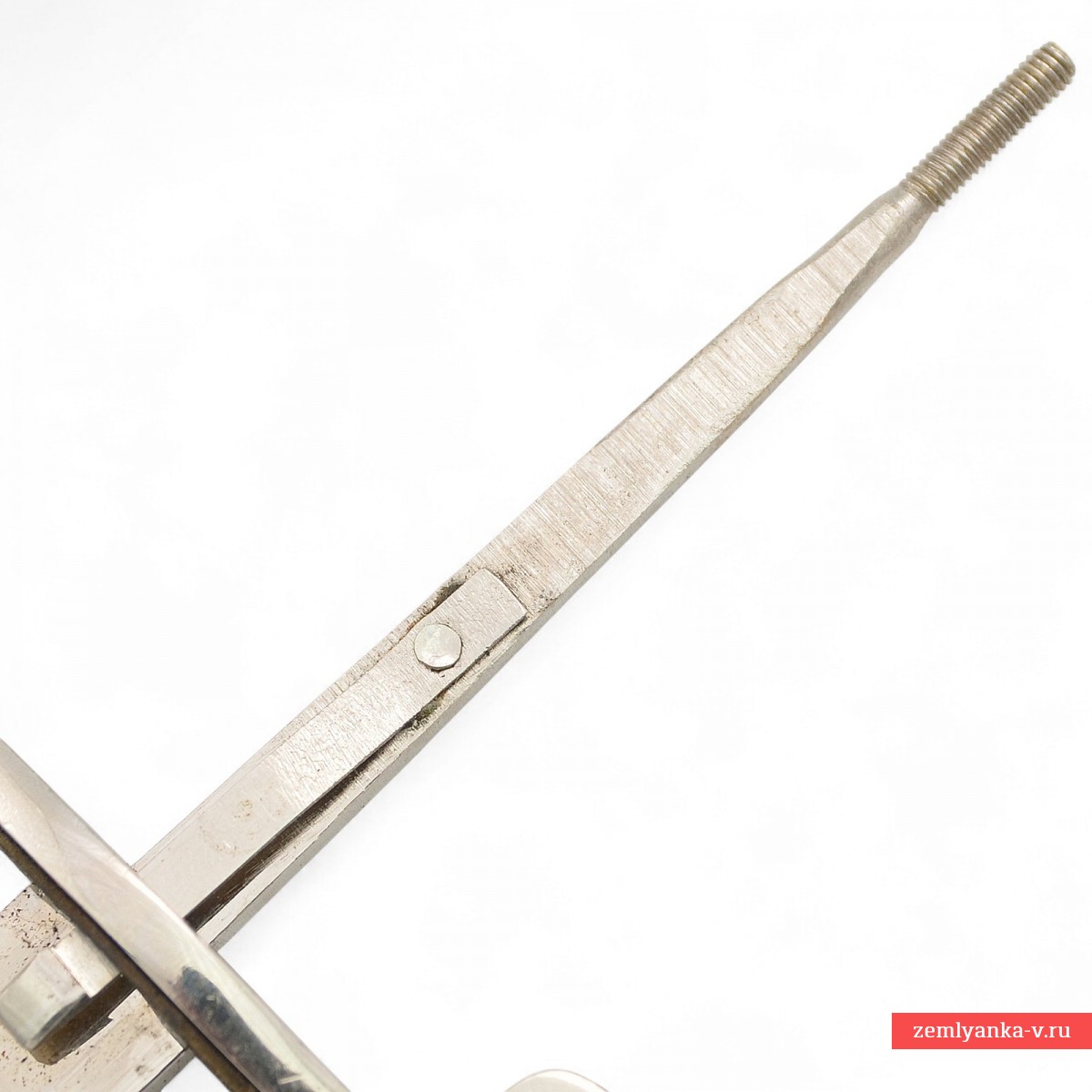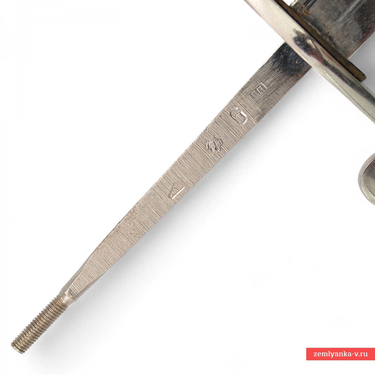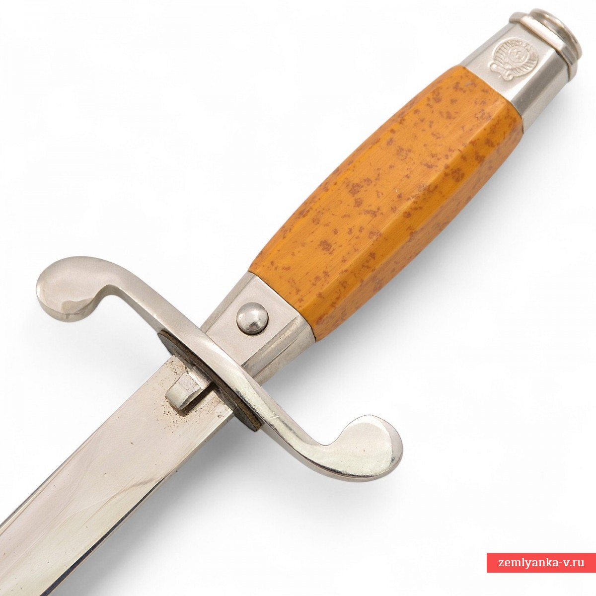 Оригинальный морской кортик в отличном коллекционном состоянии. Клинок имеет клейма только на хвостовике. Клинок, металлические части эфеса и ножен покрыты никелем, что означает принадлежность кортика офицеру речного флота. По нашему мнению, никелевое покрытие нанесено позднее на оригинальный морской кортик для увеличения его стоимости, однако утверждать это на 100% мы не можем, поэтому предмет продается по принципу «как есть». В любом случае, следует отметить исключительно высокое качество исполнения.