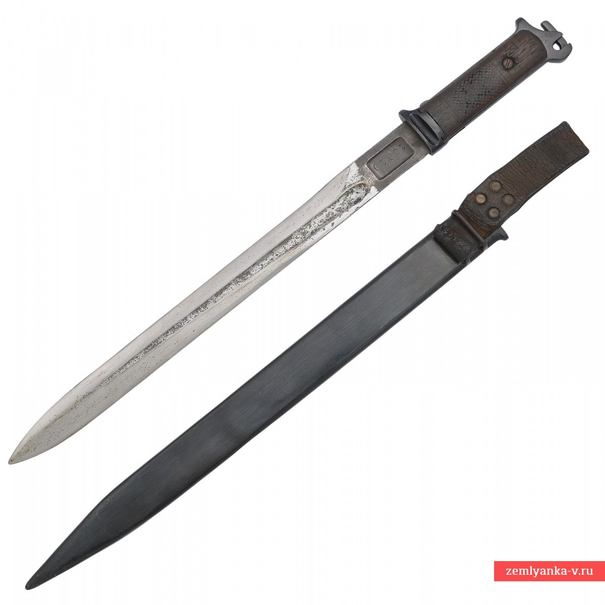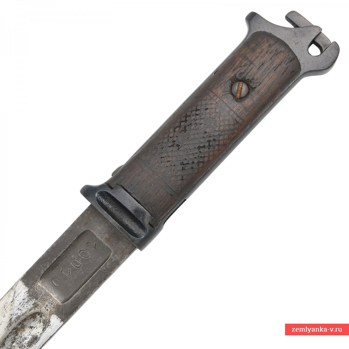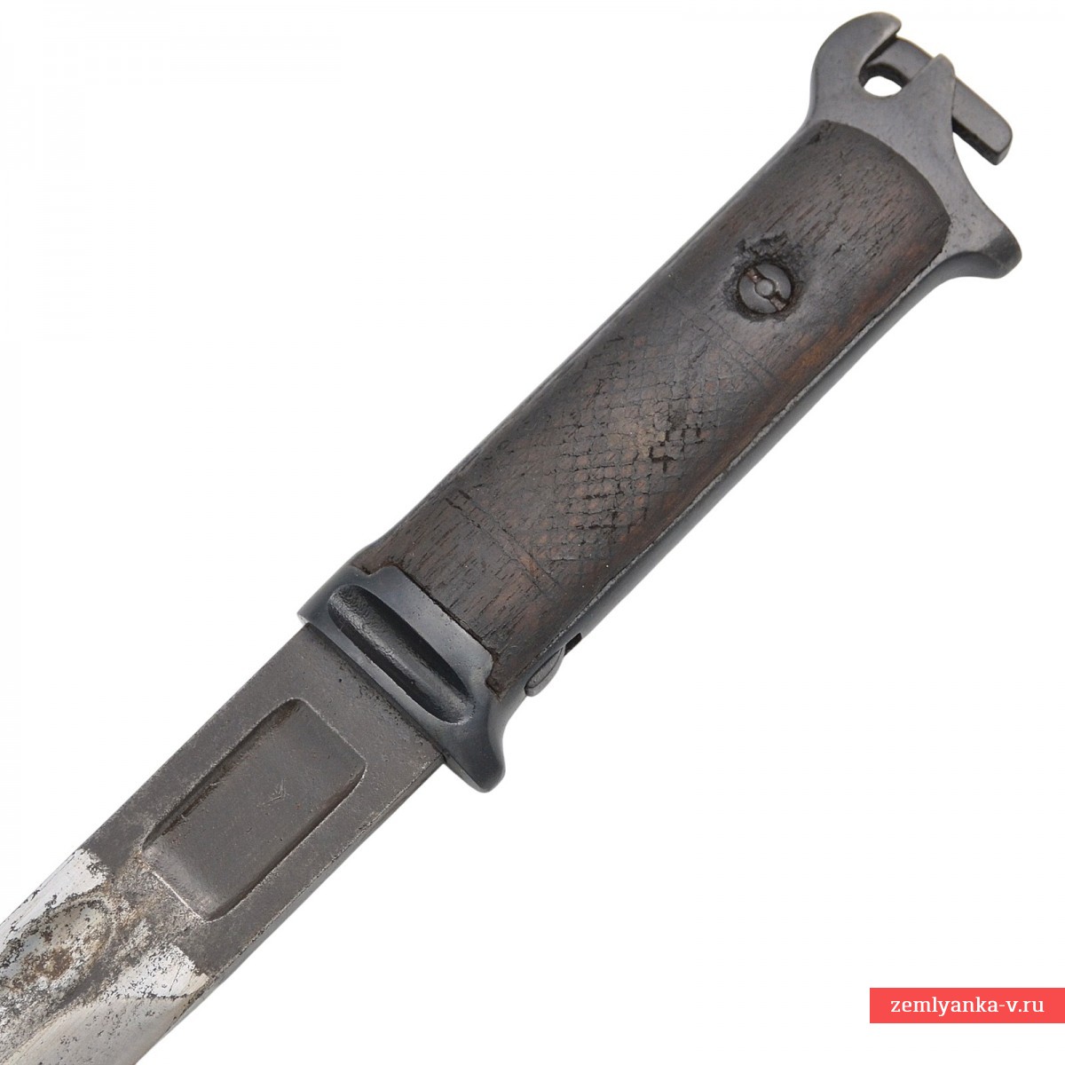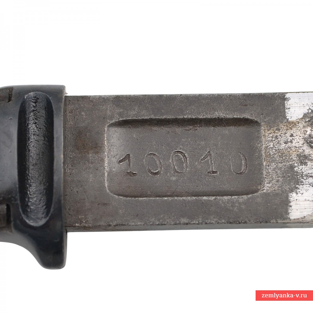 Клинок стальной, прямой, однолезвийный, со скошенным относительно продольной оси долом и прямоугольным углублением на пяте клинка с обеих сторон. На пяте клинка имеется номер штыка «10010». Рукоять образована двумя рифлеными деревянными щечками, скреплёнными с подвижной рамкой одним винтом. На хвостовике клинка за рукоятью крюк, образующий защелку вместе с вырезом в головке рукояти. В спинке рукояти паз, для фиксации штыка в боевом положении. В рукояти сбоку имеется кнопка пружинной защелкой. Ножны стальные с двумя скобами для петли подвеса. Штык комплектуется кожаной петлёй подвеса.