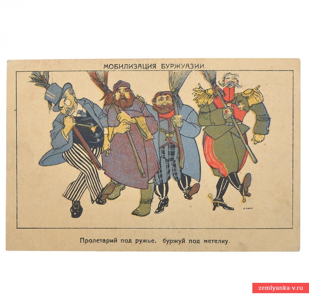 Открытка под названием «Мобилизация буржуазии» с лозунгом «Пролетарий под ружьё, буржуй под метёлку» является известным образцом советской пропаганды периода Гражданской войны в России. Автором открытки является известный советский график и карикатурист Дмитрий Моор (Дмитрий Стахиевич Орлов).Открытка была создана Государственным издательством РСФСР в период с 1918 по 1920 год. Изображение носит сатирический и агитационный характер. Оно противопоставляет: