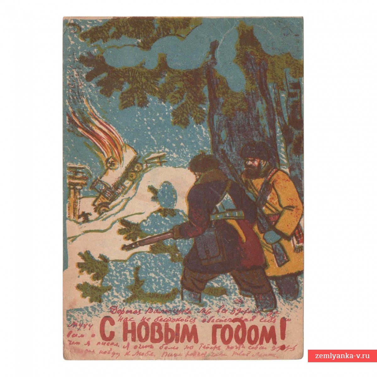 Оригинальная и достаточно редкая открытка, которая была напечатана в блокадном Ленинграде. Сюжет открытки отражает военные будни и партизанское движение, что было характерно для новогодних поздравлений того времени. Стихотворение на открытке является адаптацией нескольких строк из произведения Александра Пушкина «Евгений Онегин». Эта открытка является историческим артефактом, символизирующим надежду на мирную жизнь и Победу, к которой стремились все во время войны. Художник И. Кочергин. Полиграфмастерская ЛССХ. Гарантия подлинности. Редкая.