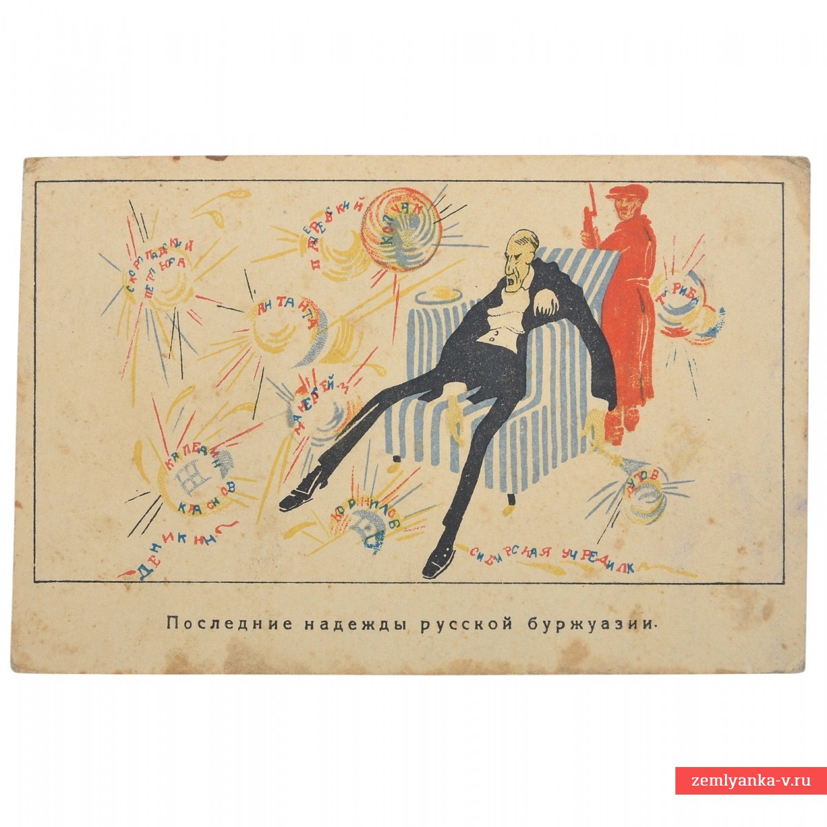 Открытка под названием «Последние надежды русской буржуазии» является известным образцом советской пропаганды периода Гражданской войны в России. На карикатуре изображен тучный буржуй (представитель капиталистического класса), который полулежит в кресле. Рядом с ним стоит красноармеец с винтовкой, а вокруг лопаются «мыльные пузыри», на которых написаны названия городов и регионов, захваченных большевиками в ходе войны. Лопающиеся пузыри символизируют крах надежд имущих классов и их союзников (Антанты) на победу над советской властью. Надписи на пузырях включают «АНТАНТА», «КРЫМ», «БАЛКАН[Ы]», «СИБИР[Ь]», «КИЕВ», «ОДЕСС[А]», «БР[ЯНСК]», «РИГ[А]», «ВЕН[ГРИЯ]», «ГЕРМА[НСКАЯ] РЕСПУБЛ[ИКА]», а на заднем плане видны надписи «ЕРЕВАН» и» [ТИФЛИС]». Открытка была издана Государственным издательством РСФСР (ГИЗ) между 1919 и 1920 годами. Хотя имя художника на самой открытке не указано, она является частью серии пропагандистских материалов, созданных известным советским графиком Дмитрием Моором (Орловым). Тираж открытки неизвестен. Загрязнения, пожелтение бумаги. Гарантия подлинности.