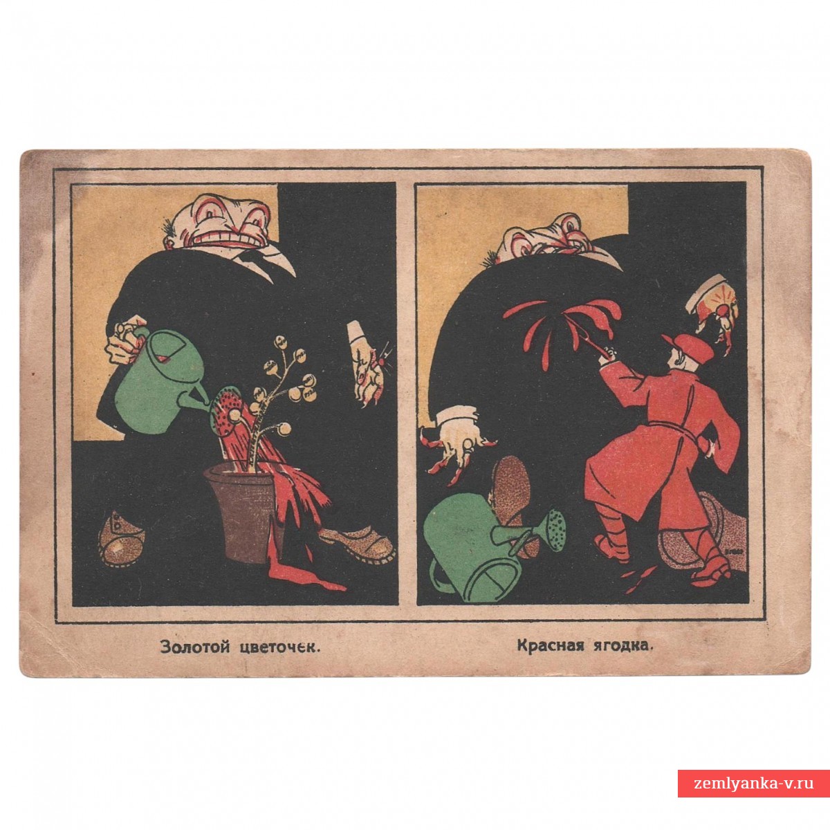 Открытка «Золотой цветочек. Красная ягодка» является образцом советской пропаганды периода Гражданской войны в России. Она была создана художником Дмитрием Моором (Орловым), известным советским карикатуристом и мастером агитационного плаката. Открытка состоит из двух частей, которые изображают контраст между капиталистом/буржуем и представителем рабочего класса: