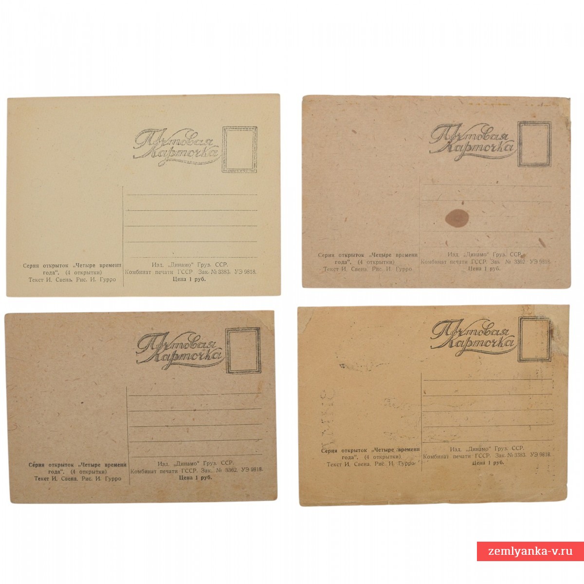 Крайне редкая серия открыток в хорошем коллекционном состоянии. Художник: И. Гурро. Автор текста И. Свен. Издательство: «Динамо» Грузинской ССР и Комбинат печати ГССР. Год издания: Приблизительно 1943 год. Каждая открытка в карикатурной форме изображает немецких солдат (фрицев) и Адольфа Гитлера, терпящих неудачи в разные сезоны 1942 и 1943 годов. Тексты внизу картинок — это стихи, описывающие боевые действия и поражения немецких войск под Сталинградом, Ростовом и Харьковом. Открытки являются примером советской политической карикатуры и пропаганды, направленной на поднятие боевого духа и высмеивание врага во время войны. Гарантия подлинности. Редкость.