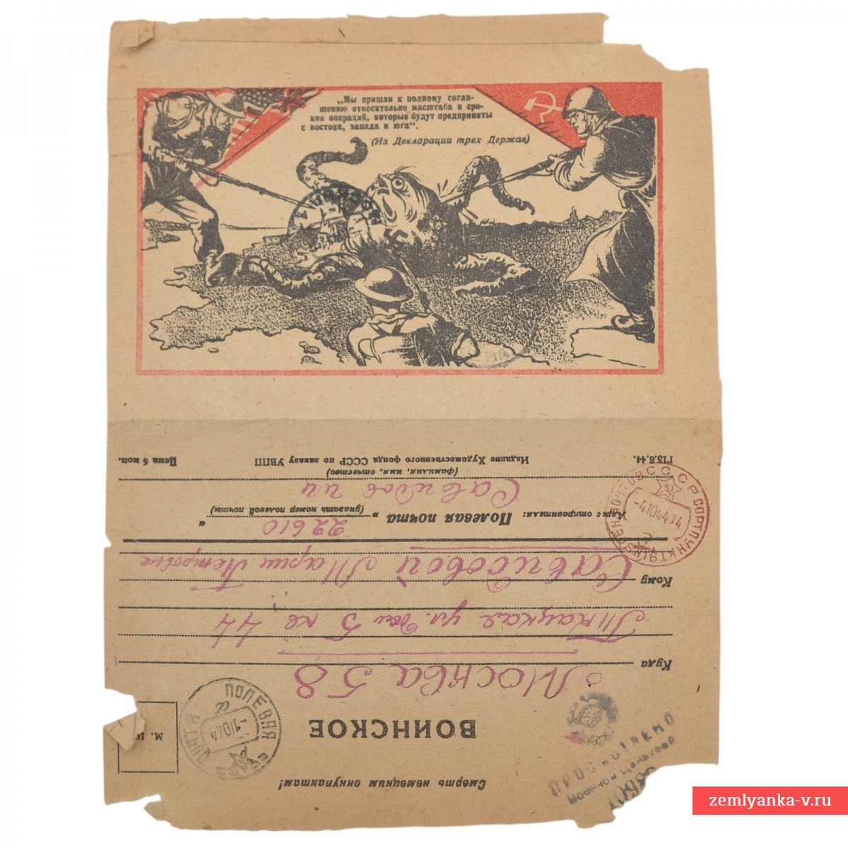 Оригинальная секретка в хорошем коллекционном состоянии, загрязнения, надрывы. Редкий тип бланка советской агитационной почтовой карточки периода Великой Отечественной войны с карикатурой художника Ивана Степановича Астапова. На рисунке под названием «Мы пришли к полному соглашению» изображены войны трёх держав, пронзающие штыками трехглавую гидру (змею), головы которой символизируют верхушку нацистской Германии. Гарантия подлинности.
