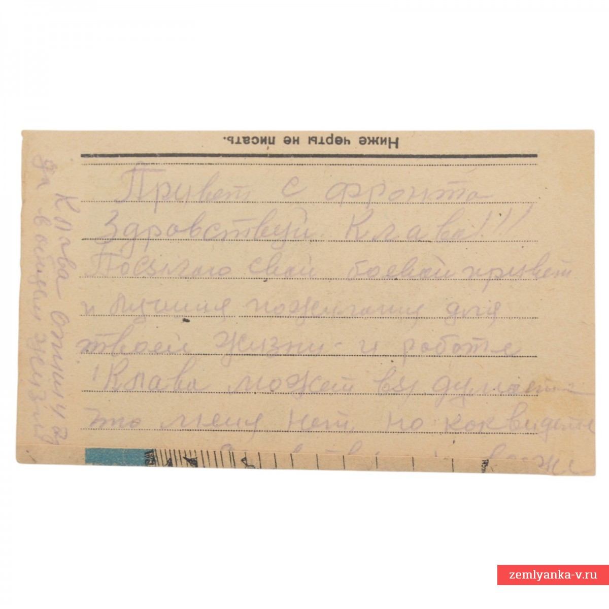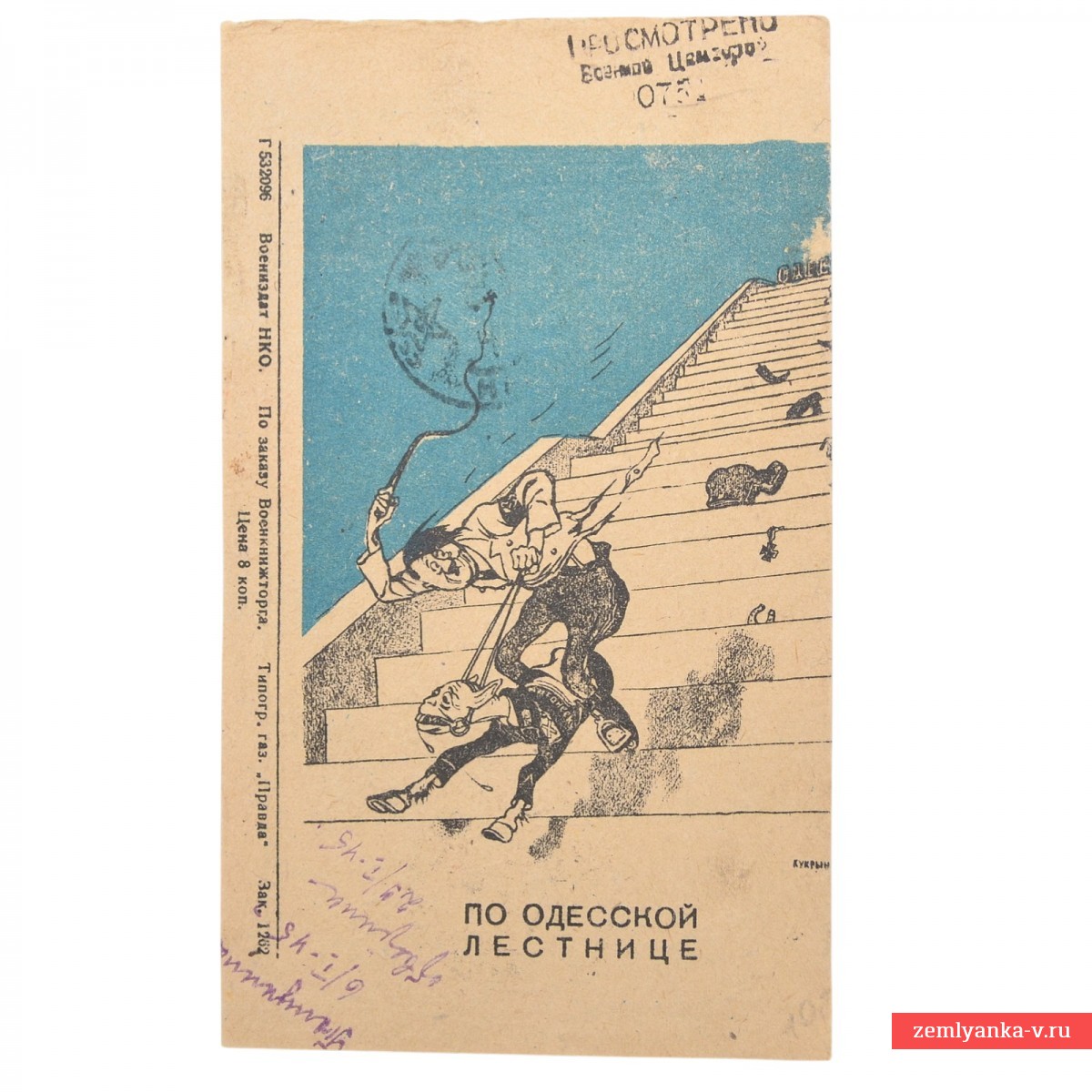 Оригинальная «секретка» в удовлетворительном коллекционном состоянии. Редкий тип бланка. К сожалению, половина письма отрезана. Карикатура под названием «По Одесской лестнице» высмеивает бегство немецко-фашистских войск из Одессы в апреле 1944 года. На рисунке изображен карикатурный немецкий офицер, который в панике скатывается по знаменитой Потемкинской лестнице, бросая вещи и оружие. Авторы: Художники Кукрыниксы (Михаил Куприянов, Порфирий Крылов и Николай Соколов). Карточка выпущена издательством Воениздат НКО (Народного комиссариата обороны) по заказу Военкнижторга.
