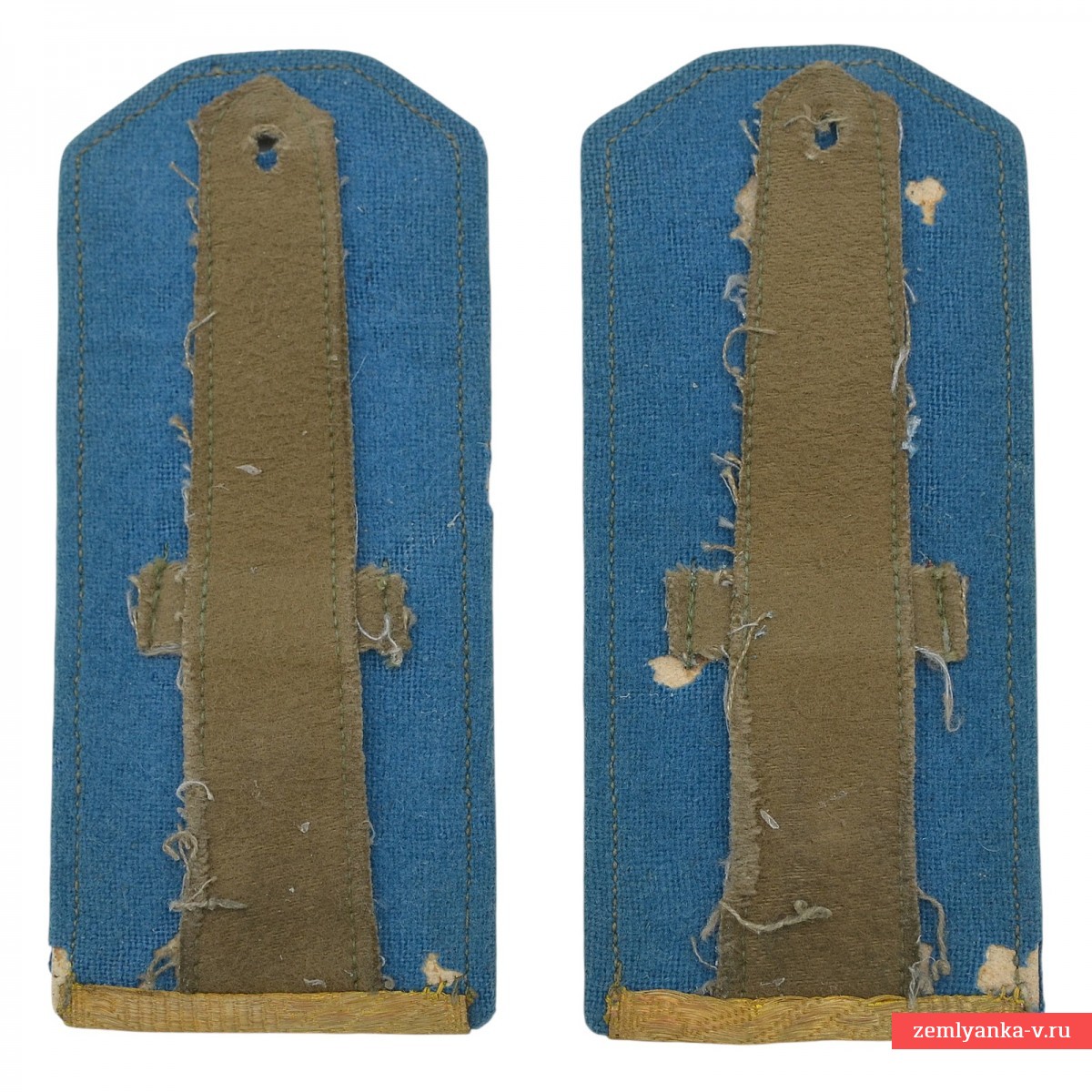 Сукно голубого цвета, золотой галун. Пара оригинальных погон в неплохом состоянии. Рост1. Погоны этого типа были введены указом Президиума Верховного Совета СССР 06.01.1943 «О введении новых знаков различия для личного состава Красной Армии». Незначительные повреждения подбоя от моли. Без пуговиц. Гарантия подлинности.