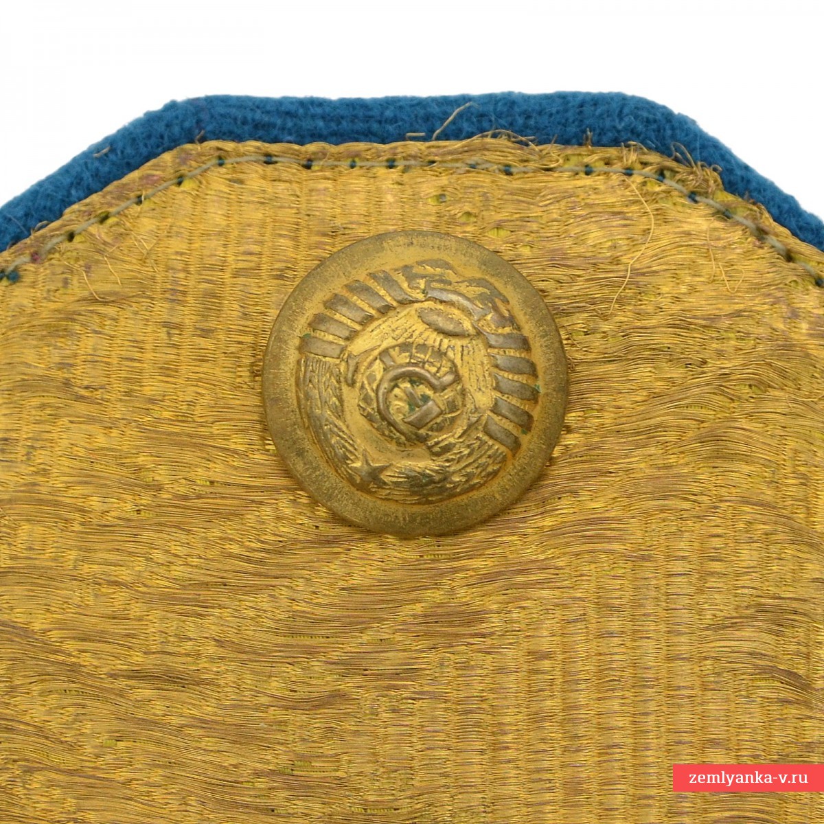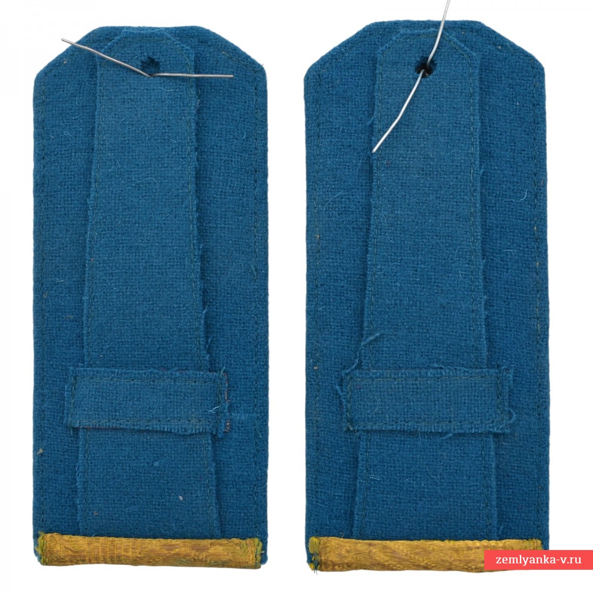 Сукно голубого цвета, золотой галун. Пара оригинальных погон в очень хорошем состоянии. Рост1. Погоны этого типа были введены указом Президиума Верховного Совета СССР 06.01.1943 «О введении новых знаков различия для личного состава Красной Армии». Пуговицы с гербом на 11 лент. Очень редкие. Гарантия подлинности.