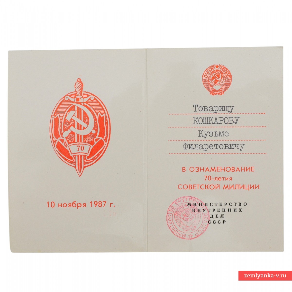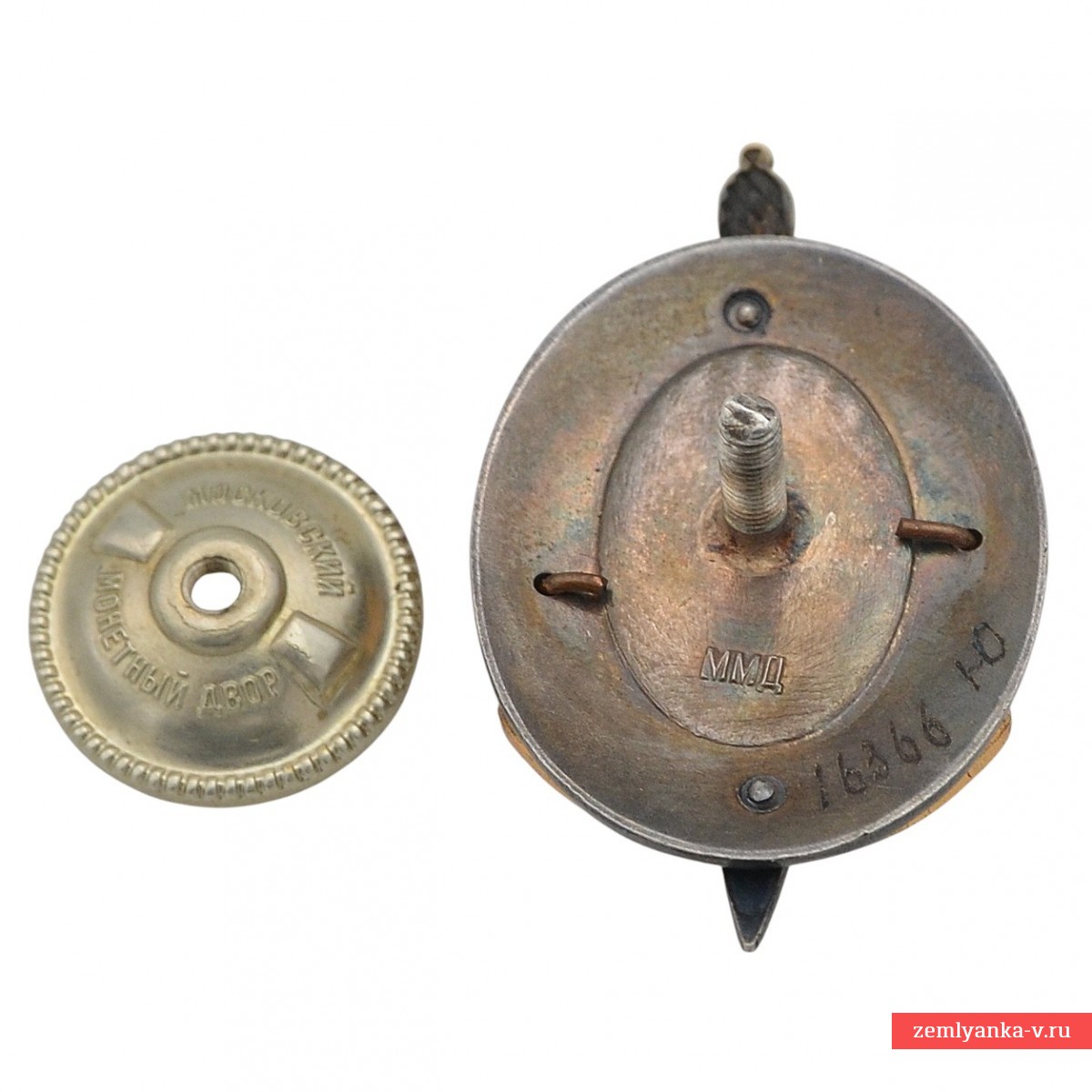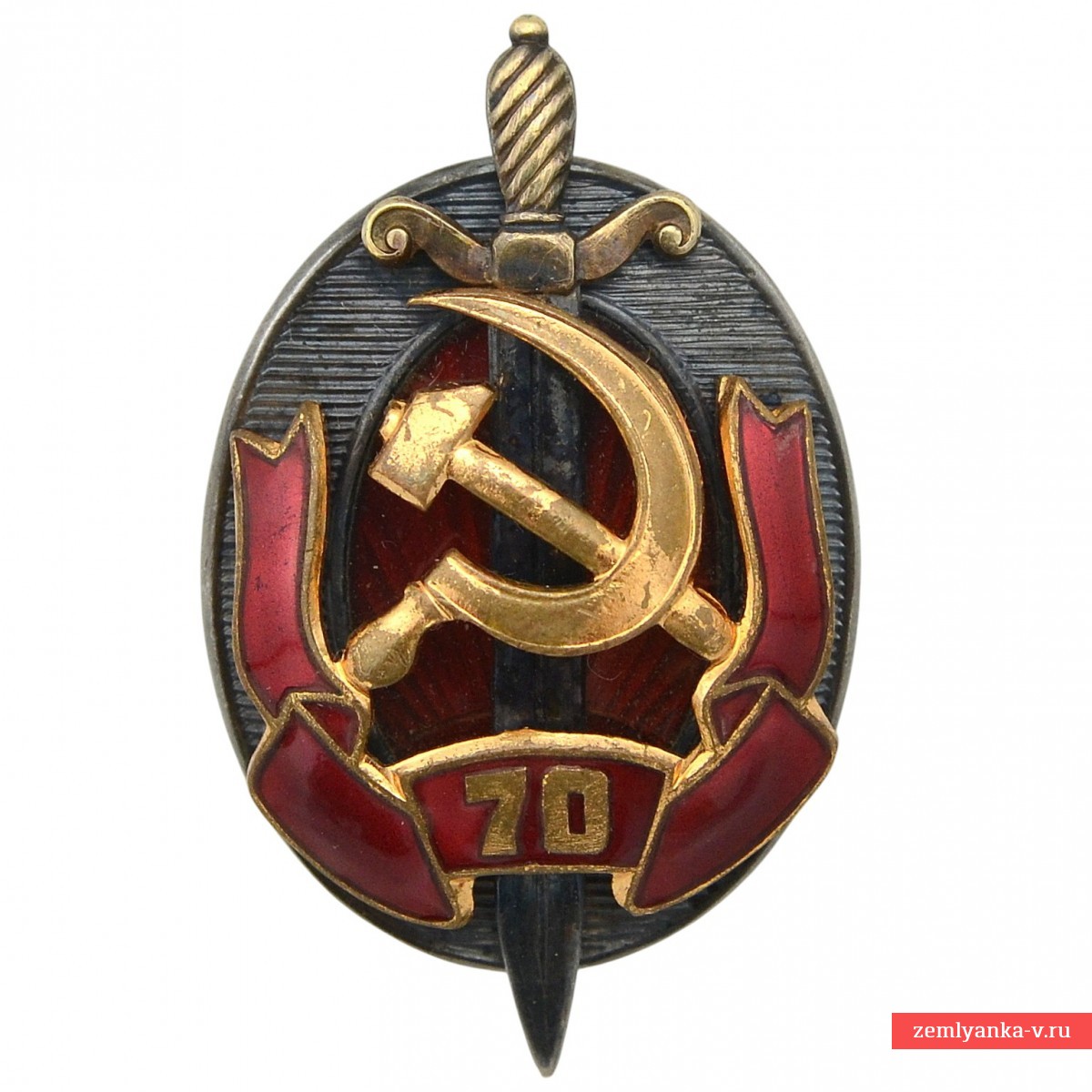 Оригинальный знак в прекрасном состоянии. Изготовлен в 70-летнему юбилею МВД в 1987 году. Серебро, эмаль. Знак представляет собой овальный щит красной эмали с наложенным на него серебристого цвета мечом с золотой рукоятью. На меч в центре знака наложены позолоченные серп и молот. В нижней части знака вдоль золотистого цвета ободка щита — лента красной эмали с надписью в центральной части «70». На оборотной стороне номер награждения 16366 Ю. В комплекте также оригинальный наградной документ и картонный футляр. Гарантия подлинности. Редкий.