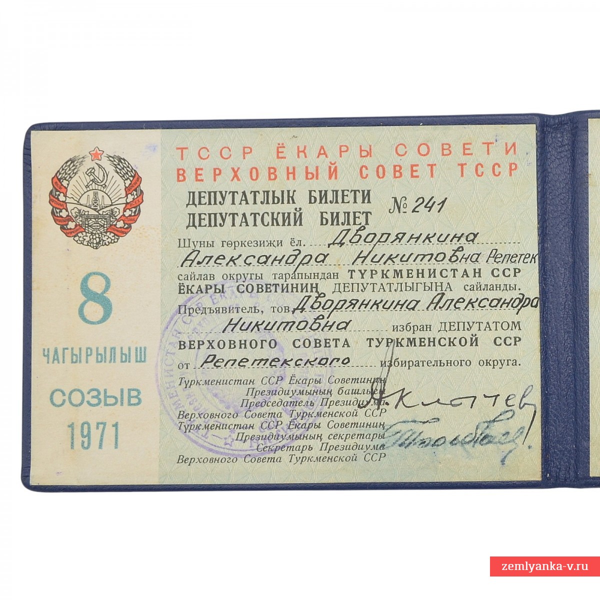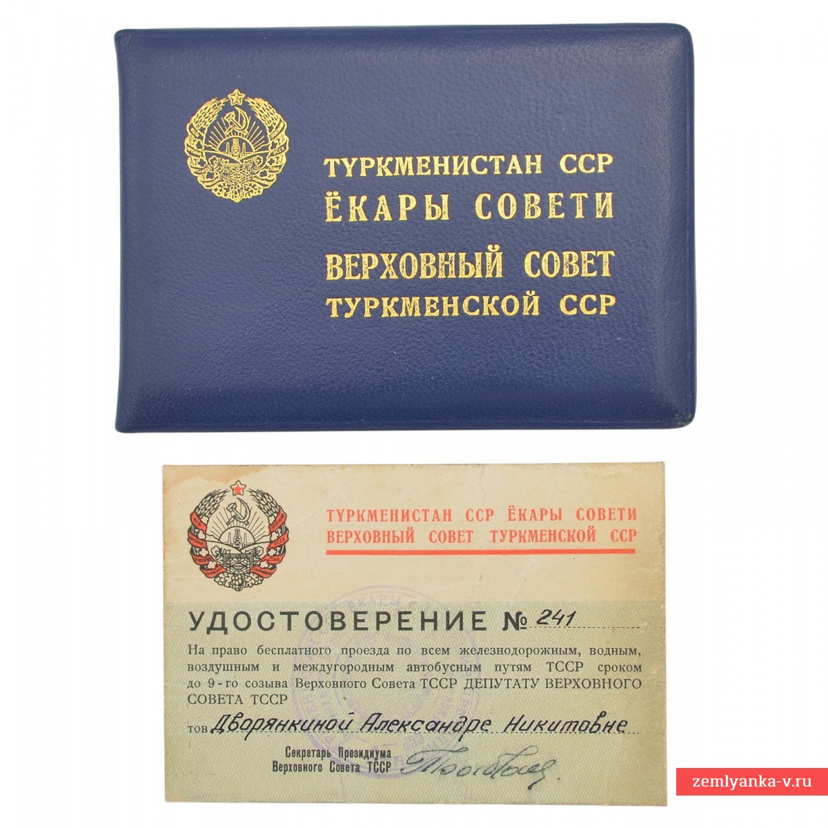 Лот состоит из знака депутата Верховного совета Туркменской ССР, удостоверения и вкладыша-проездного, принадлежавших Дворянкиной Александре Никитовне. Все элементы лота находятся в очень хорошем состоянии. Знак – серебро, эмаль. Гарантия подлинности.