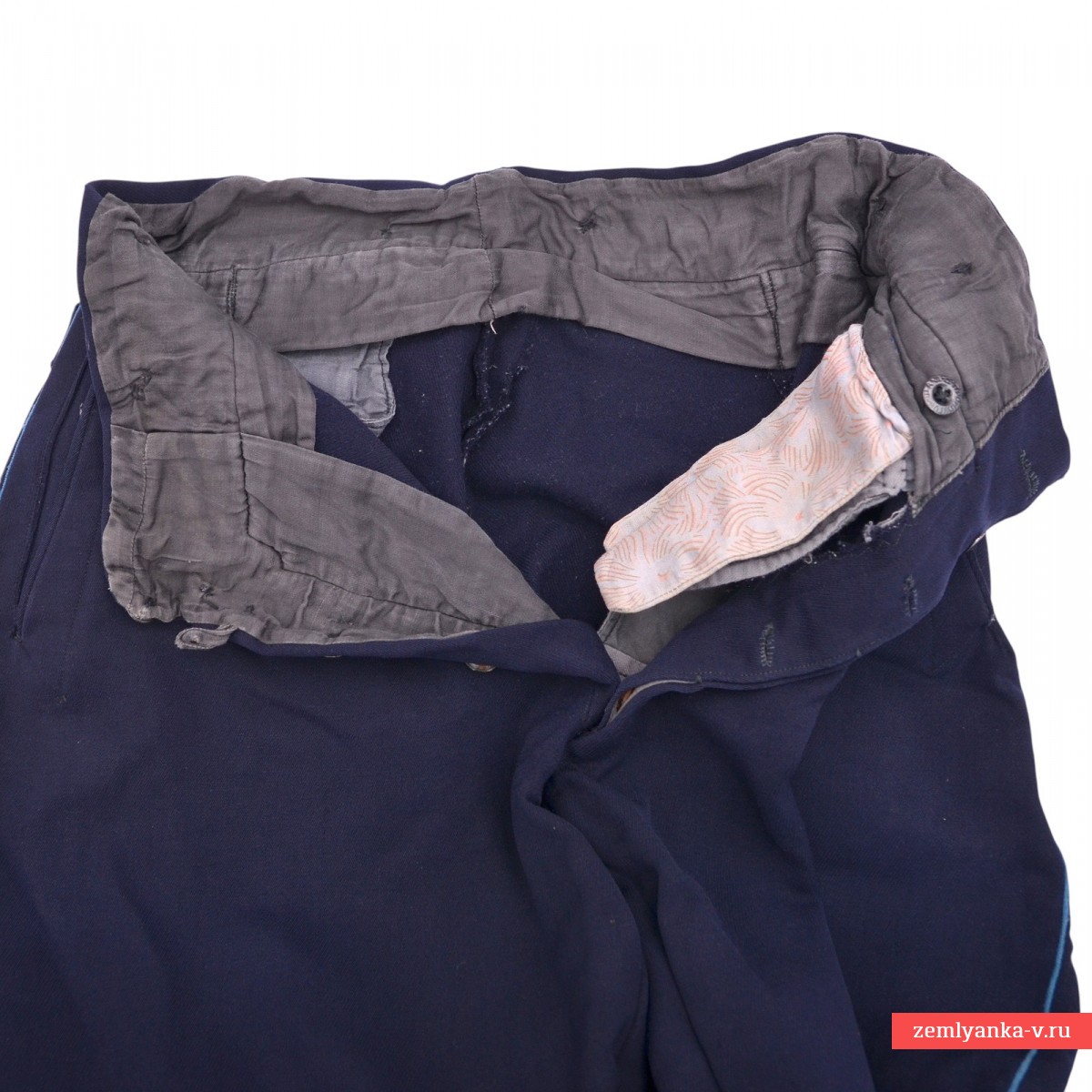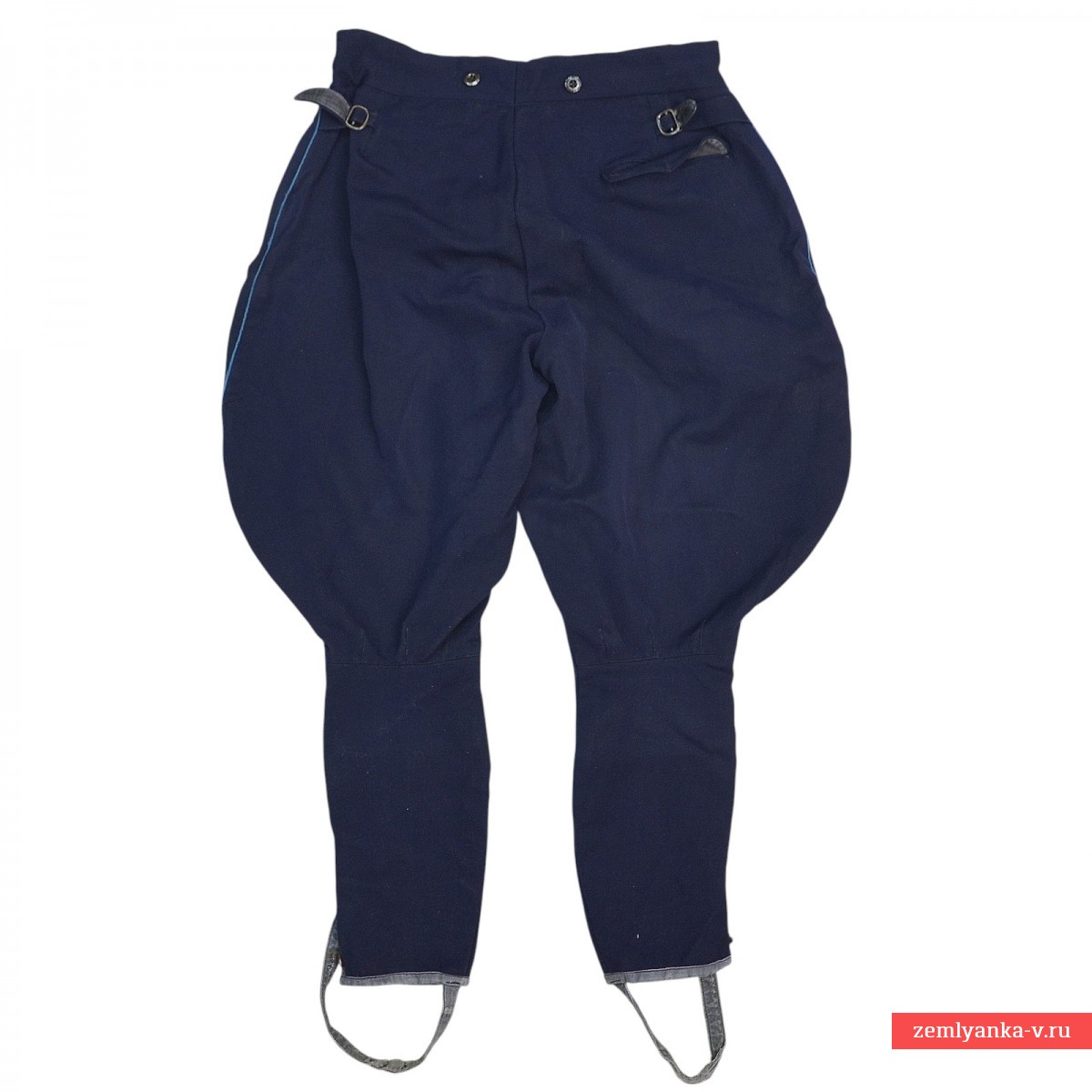 Оригинальные и достаточно редкие бриджи в хорошем состоянии. Пошиты из шерстяной диагональной ткани темно-синего цвета с голубой выпушкой по бокам. Они состоят из двух передних и двух задних половинок, имеют два боковых прорезных кармана, один часовой карман, один задний карман, два поясных затяжника и внизу штрипки. Брюки застегиваются на пять пуговиц и один крючок. Размер средний. Введены приказом Наркома Обороны СССР № 176 от 3 декабря 1935 года. Отменены приказом Наркома Обороны СССР № 005 от 1 февраля 1941 года: «Переход на новые виды обмундирования начать с 1 октября 1941г. и полностью закончить к концу 1942г. Выдачу вновь вводимых на снабжение предметов обмундирования производить по истечении сроков носки предметов старой формы». Повторно введены приказом Наркома Обороны СССР № 25 от 15 января 1943 года. Гарантия подлинности.