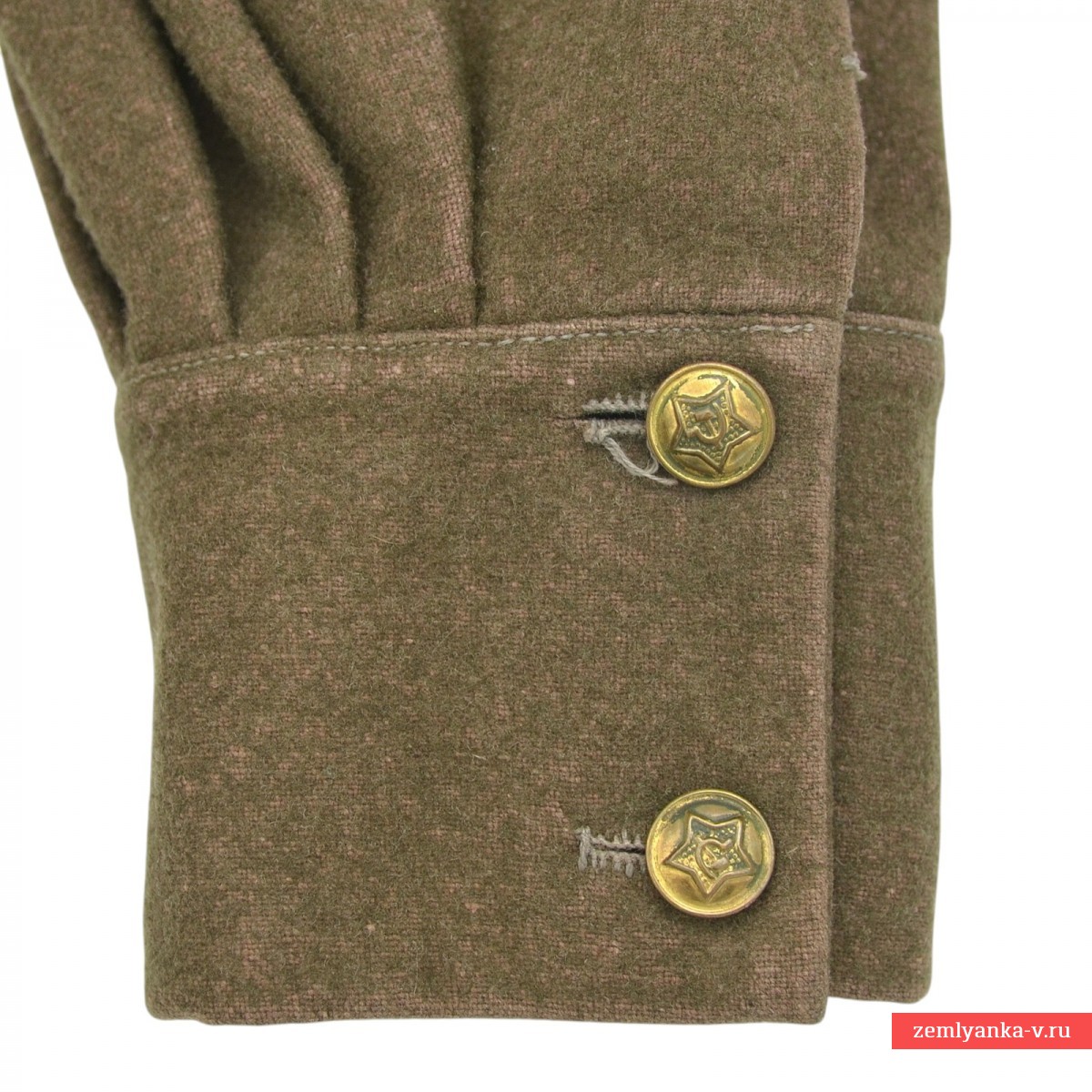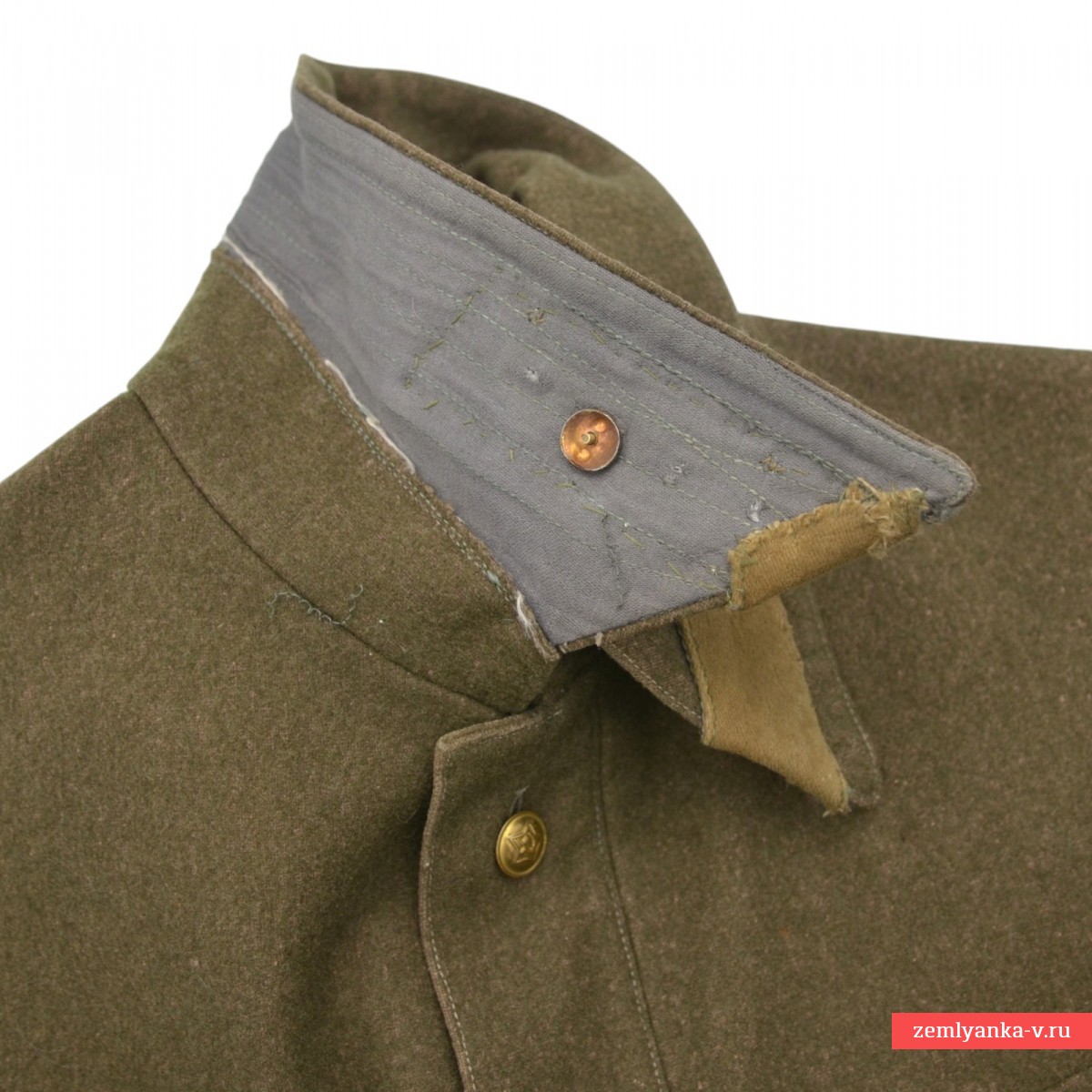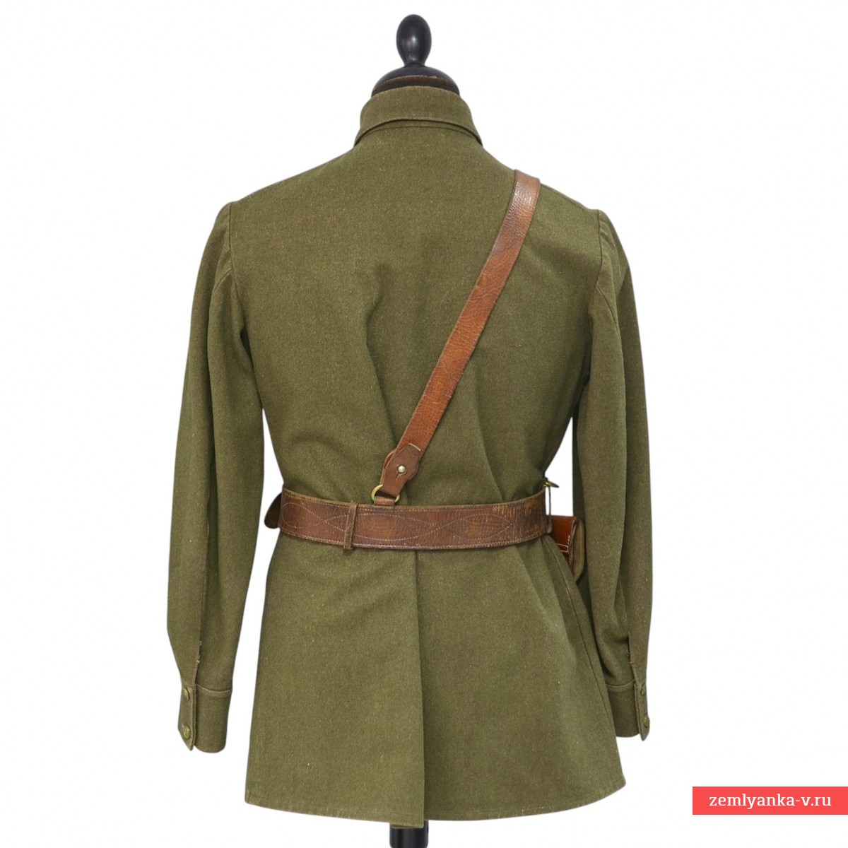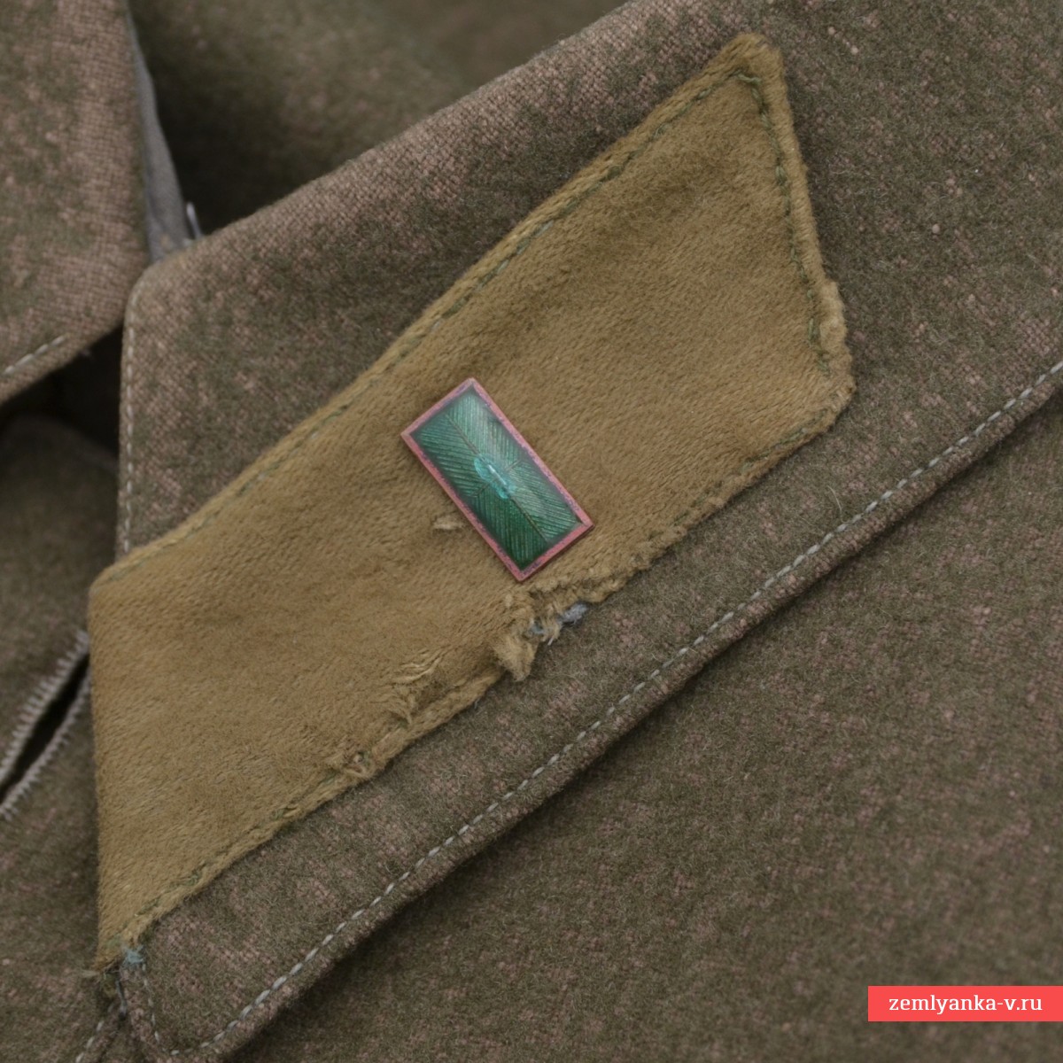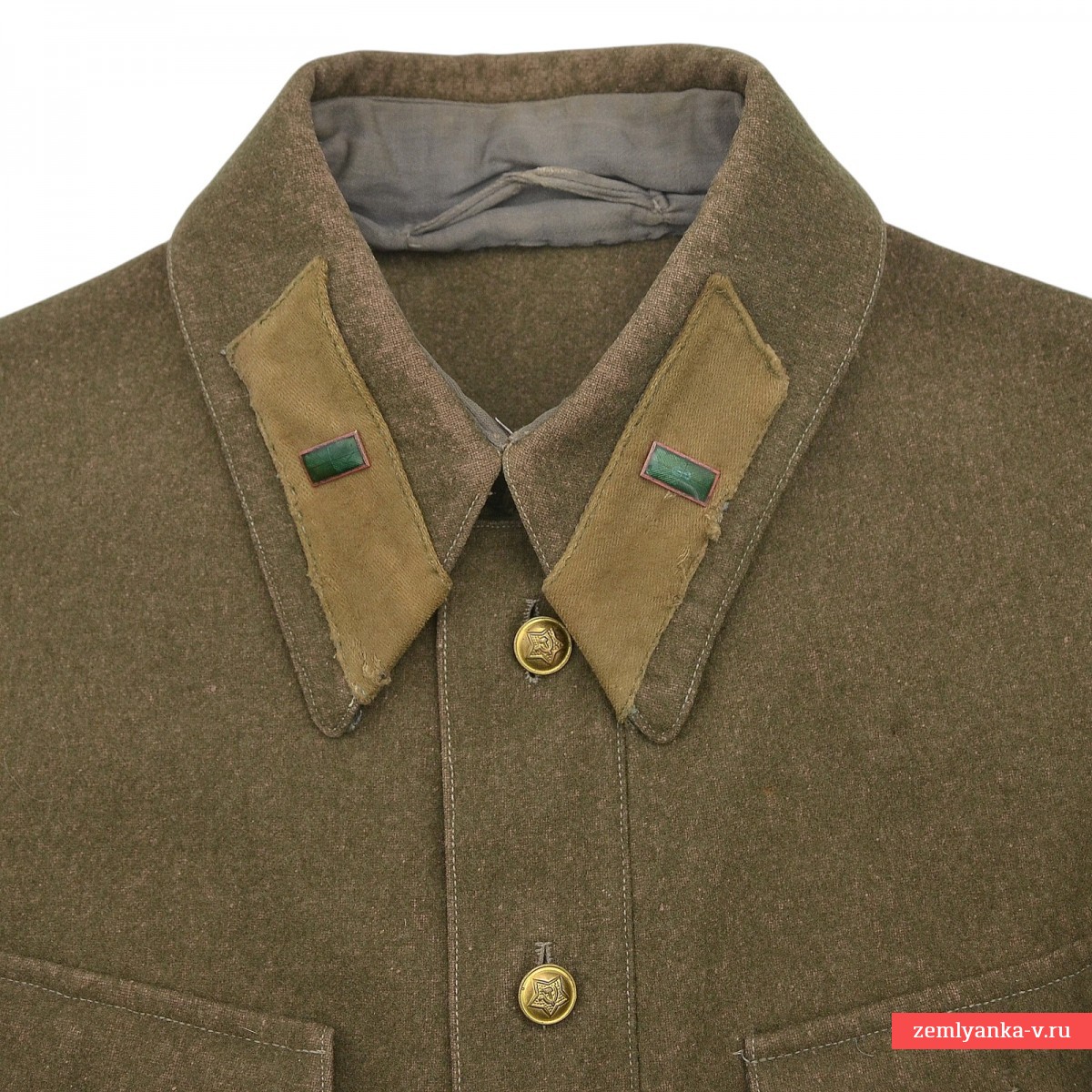 Редкая комсоставская гимнастерка в очень хорошем коллекционном состоянии. Изготовлена из сукна защитного цвета с отложным воротником, застегивающимся на один крючок. На концах воротника нашиты оригинальные петлицы защитного цвета. Капитанские шпалы с очень красивой изумрудной эмалью, немагнитные. Гимнастерка имеет нагрудную планку с застежкой на три пуговицы и два нагрудных пристроченных кармана с клапанами на одной пуговице. Рукава имеют обшлага с двумя пуговицами. Пуговицы гимнастерки металлические установленного образца. Незначительные повреждения ворса от моли, потертости от носки на воротнике. Размер около 48. Показанные на фото ремень с портупеей, кобура в комплект не входят. Введена приказом Наркома Обороны СССР № 005 от 1 февраля 1941 года. Отменена приказом Наркома Обороны СССР № 25 от 15 января 1943 года. Гарантия подлинности.