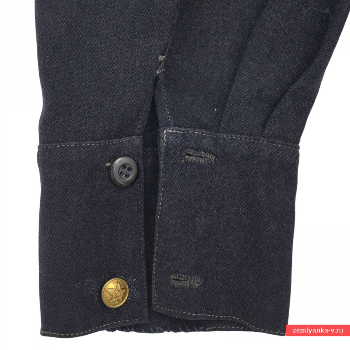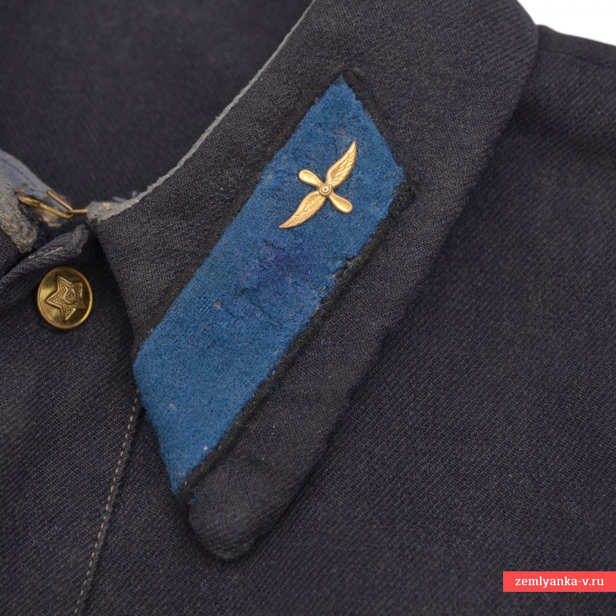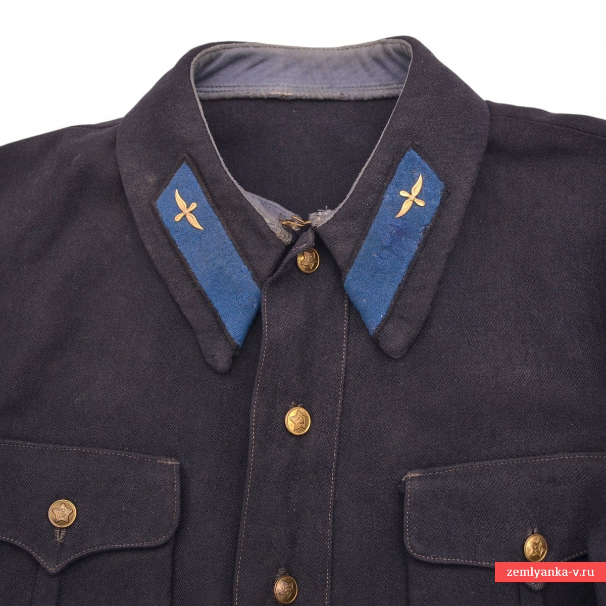 Оригинальная и очень интересная гимнастерка курсантского состава ВВС РККА в очень хорошем состоянии. Гимнастерки из темно-синей суконной ткани стали активно появляться в ВВС в середине 1934 года, несмотря на то, что приказа об их введении не было. Этому нарушению способствовал тот факт, что полугрубое сукно, предназначенное для пошива брюк к повседневной форме, тоже было темно-синим и выдавалось, подчас, сразу на весь костюм (на брюки и рубаху). Случаи пошива комплектов формы целиком из темно-синего сукна имели массовое распространение, как при индивидуальных заказах, так и при коллективных заготовках, осуществляемых, как правило, военно-учебными заведениями для своих курсантов. О принадлежности курсантам говорит материал гимнастерки — темно-синяя (почти черная) шерстяная диагональ, использовавшаяся, как правило, для пошива галифе рядового состава РККА. Размер приблизительно 48. На воротнике гимнастерки установлены петлицы ВВС РККА обр. 1928 года с «птичками» обр. 1922 года. Одна из петлиц со следами реставрации. Ремень в комплект не входит. Гарантия подлинности.