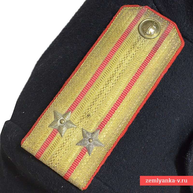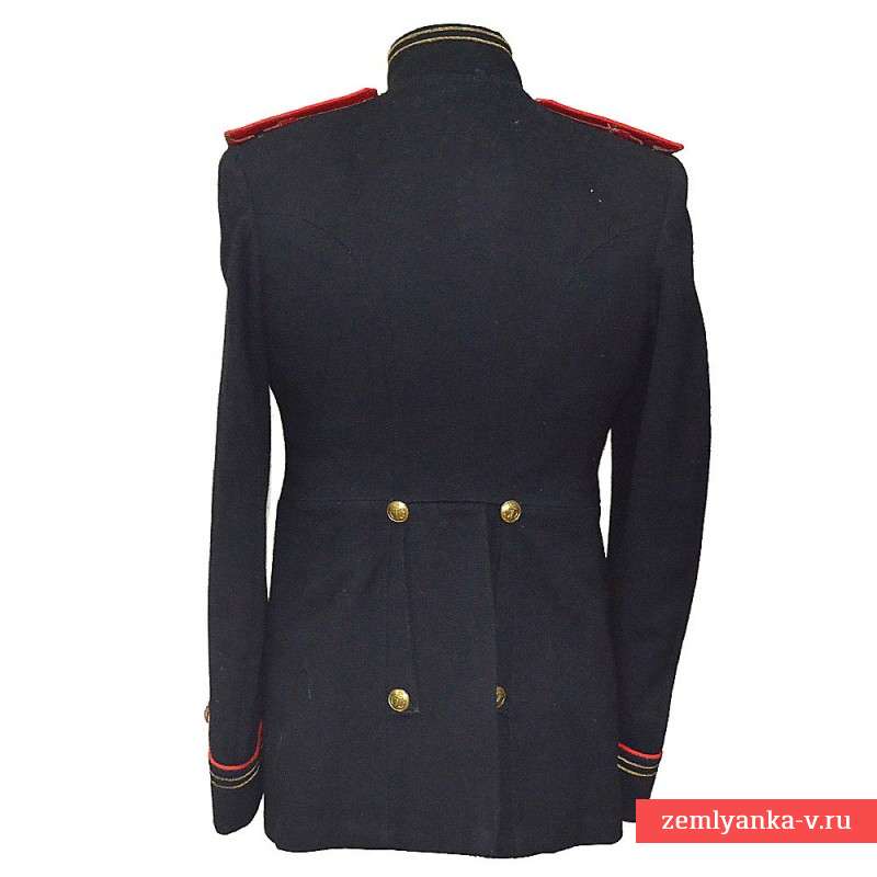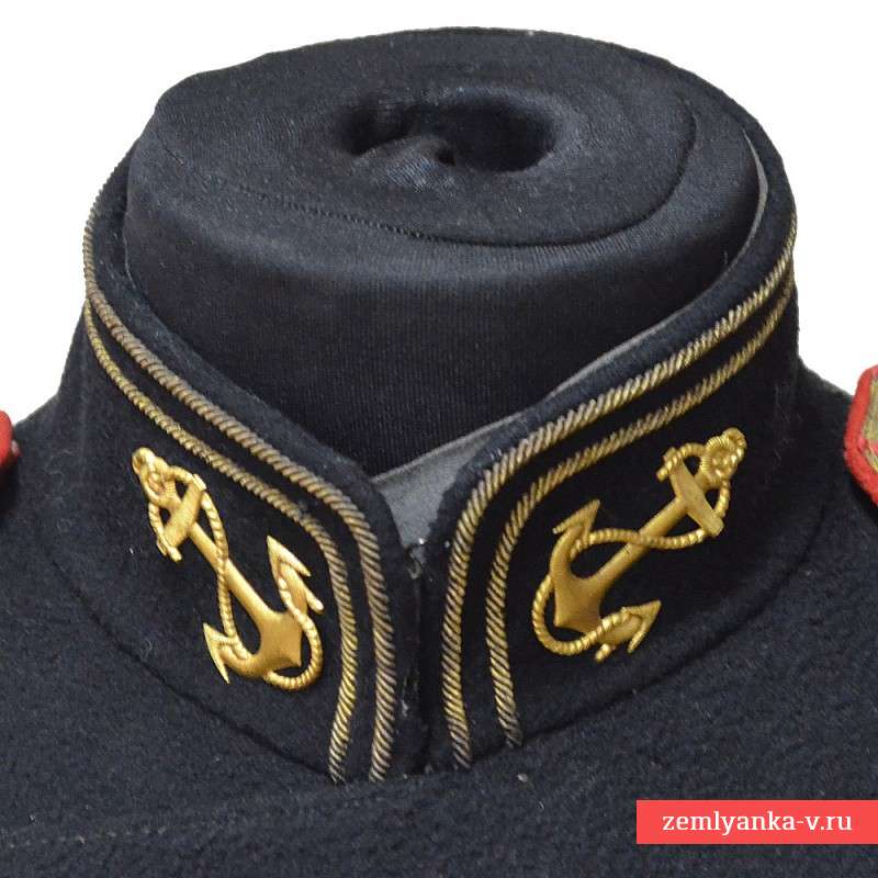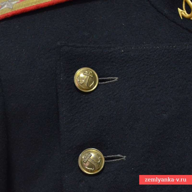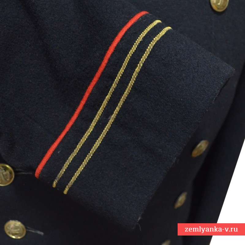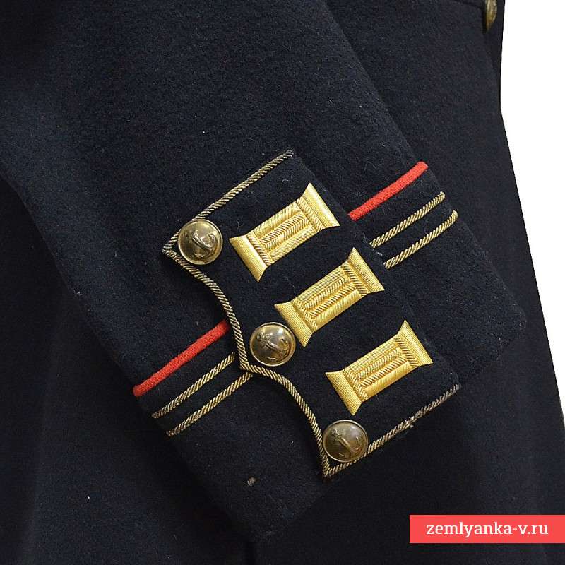 Мундир пошит из толстого сукна черного цвета, оригинально обставлен знаками различия, состоящими из погон с желтым металлизированным галуном и накладных металлических якорей и нарукавных катушек. Пуговицы из желтого металла. Все знаки различия установлены оригинально владельцем. Общая длина с воротником — 79 см, длина рукава 67-68 см, ширина плеч — 44-45 см. Гарантия подлинности.