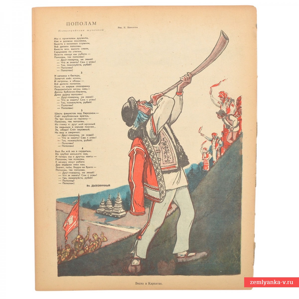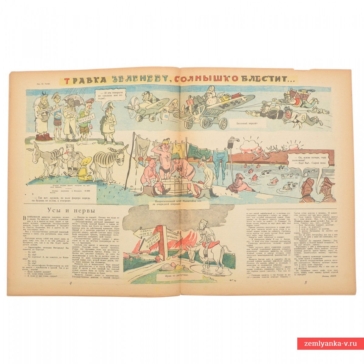 Оригинальный журнал в хорошем коллекционном состоянии, надрывы, загрязнения, лисьи пятна. Формат 32,7x25,6 см. Издание газеты «Правда». Выпуск посвящен 1 Мая 1944 года. Это время триумфального наступления Красной Армии (освобождение Крыма и Одессы). На обложке изображен пограничный столб СССР, мимо которого войска устремляются на запад, — символ восстановления государственной границы. Цветные иллюстрации и карикатуры. Гарантия подлинности.