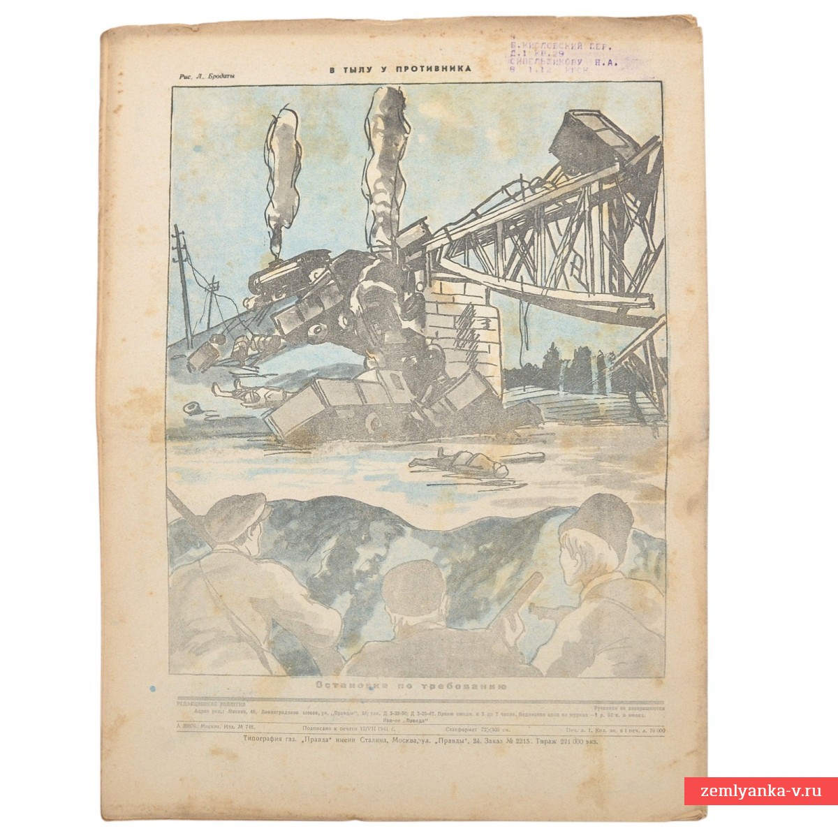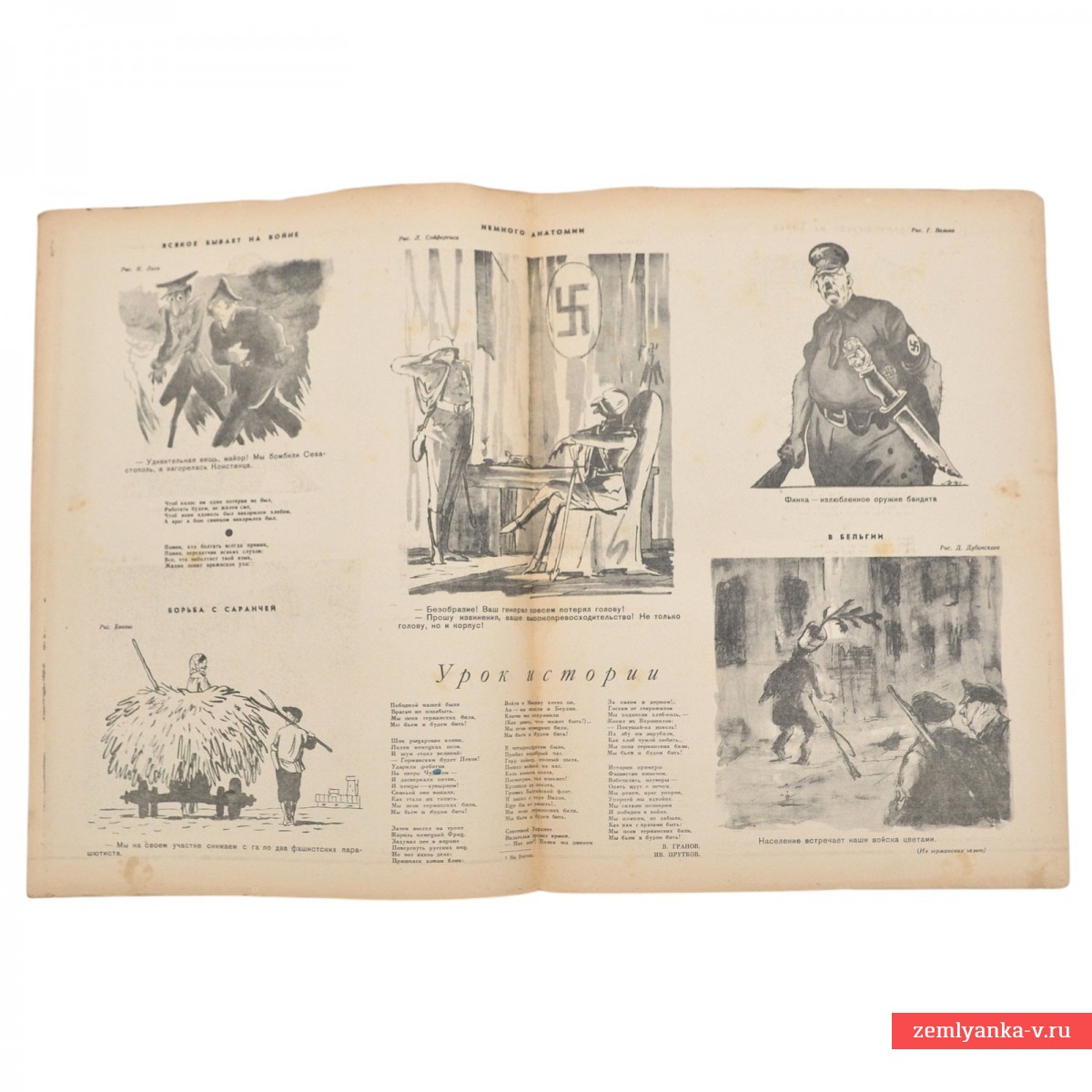 Редкий подлинный журнал в хорошем коллекционном состоянии, надрывы, загрязнения, лисьи пятна. Формат 34,5x26 см. Издание газеты «Правда». Это один из первых номеров, где советская сатира полностью перестроилась на военные рельсы. На обложке — едкая карикатура на высшее командование вермахта в «полевой ставке», высмеивающая их замешательство перед лицом советского сопротивления. Цветные иллюстрации и карикатуры. Гарантия подлинности.