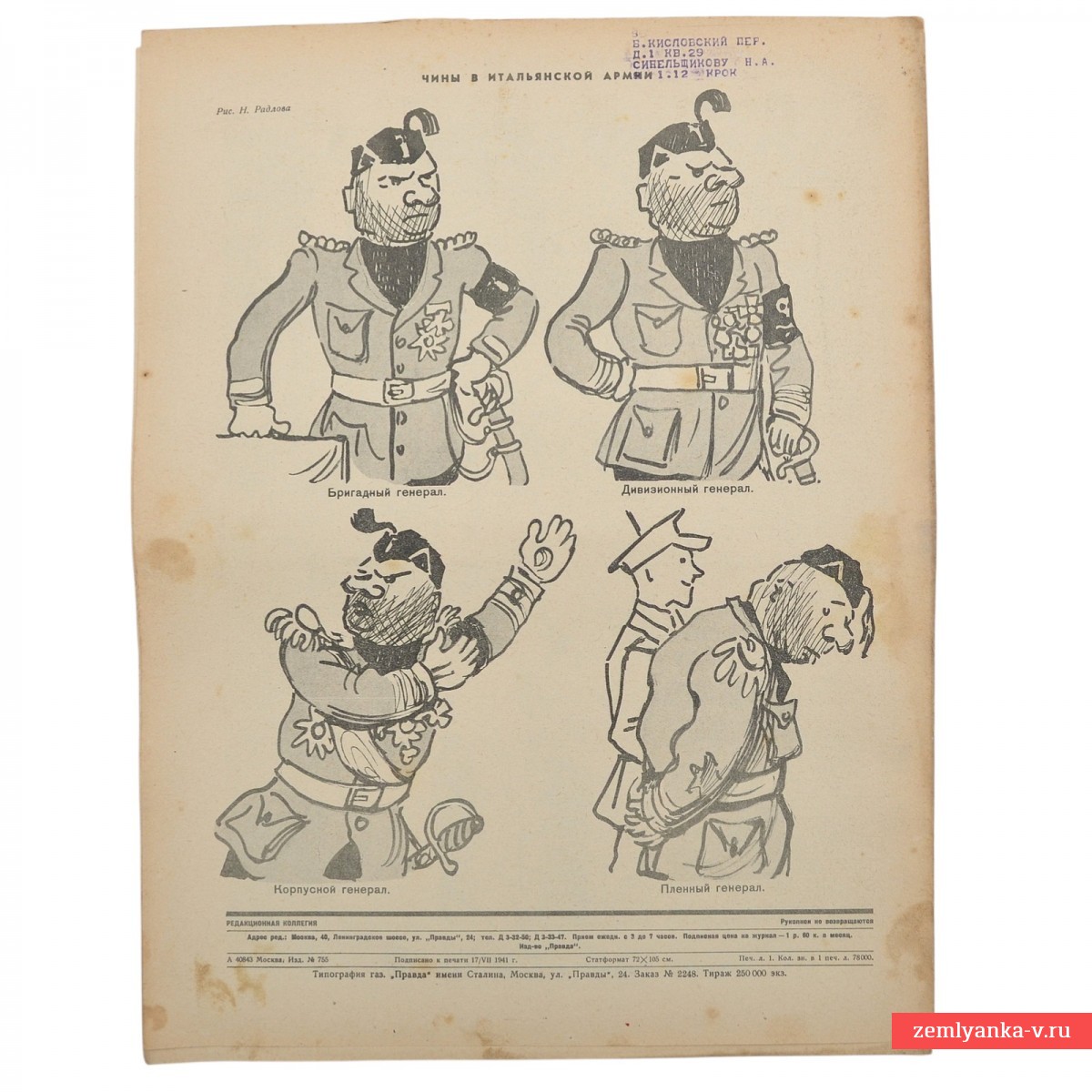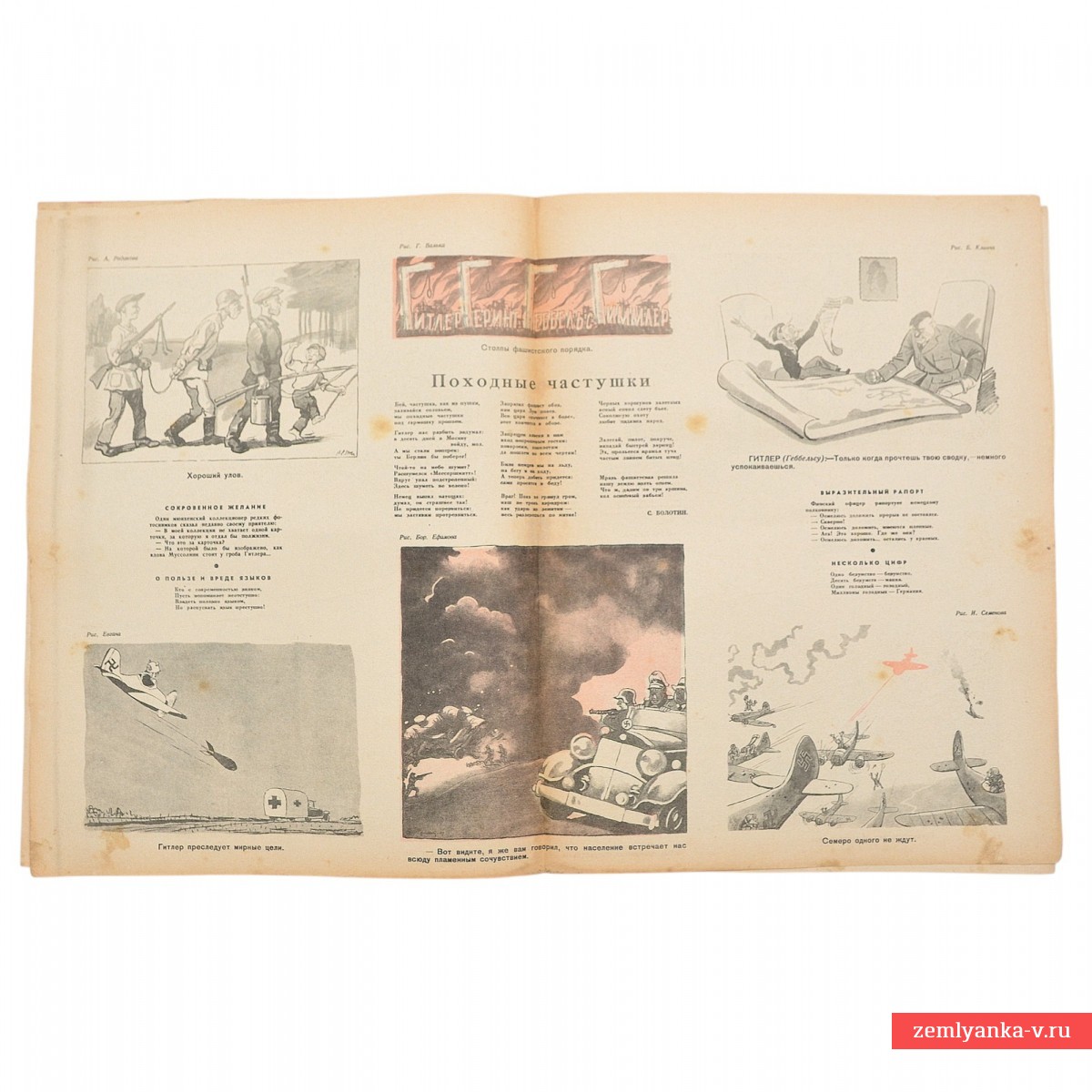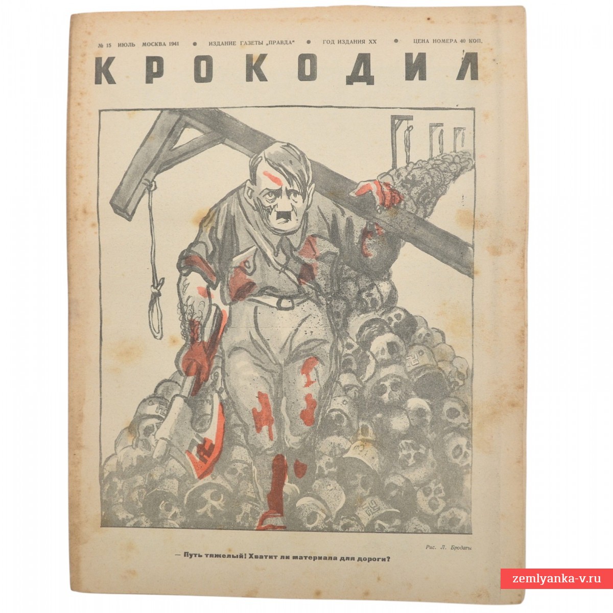 Оригинальный журнал в неплохом коллекционном состоянии, надрывы, загрязнения, лисьи пятна. Размер 34,3x26 см. Издание газеты «Правда». На обложке — Гитлер в образе мясника в крови, несущий на плече виселицу мимо горы черепов. Обложку создали легендарные Кукрыниксы (Михаил Куприянов, Порфирий Крылов, Николай Соколов). Цветные иллюстрации и карикатуры. Гарантия подлинности.