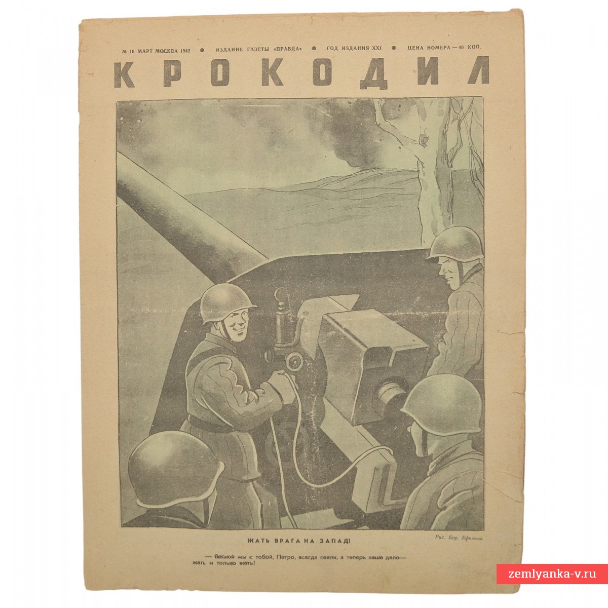 Бумага. Журнал находится в хорошем коллекционном состоянии. Размер 340*254. Цветные иллюстрации и карикатуры. На обложке изображены советские солдаты Красной Армии, ведущие артиллерийский огонь из орудия. Главный заголовок на обложке гласит: «ЖАТЬ ВРАГА НА ЗАПАД!». Под основным рисунком приводится диалог:» – Весной мы с тобой, Петро, всегда сеяли, а теперь наше дело – жать и только жать!». Обложка несет ярко выраженный агитационный характер, призывая к активным действиям против врага и используя образ урожая для усиления эмоционального воздействия на читателя. Гарантия подлинности.