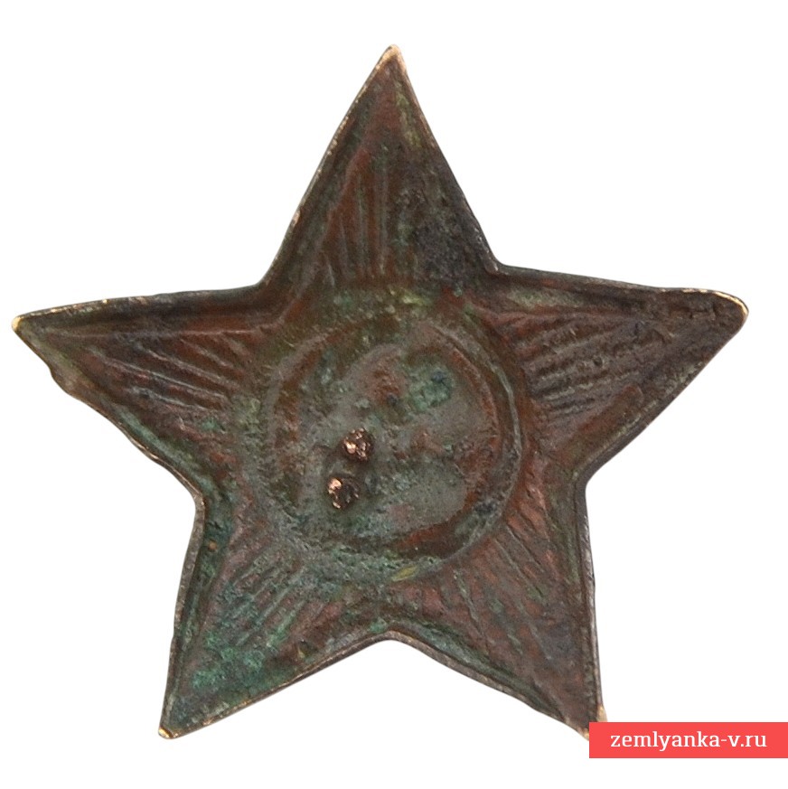 Оригинальная звезда в удовлетворительном состоянии. Латунь, штамповка. Предмет из земли. Усы и эмаль отсутствуют. Размер по лучам 23 мм. Гарантия подлинности.